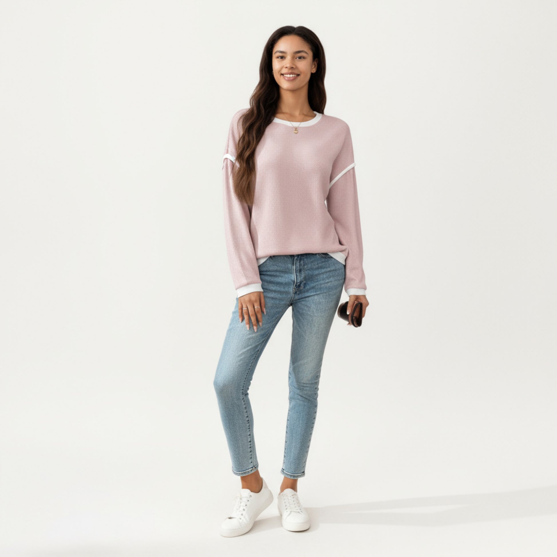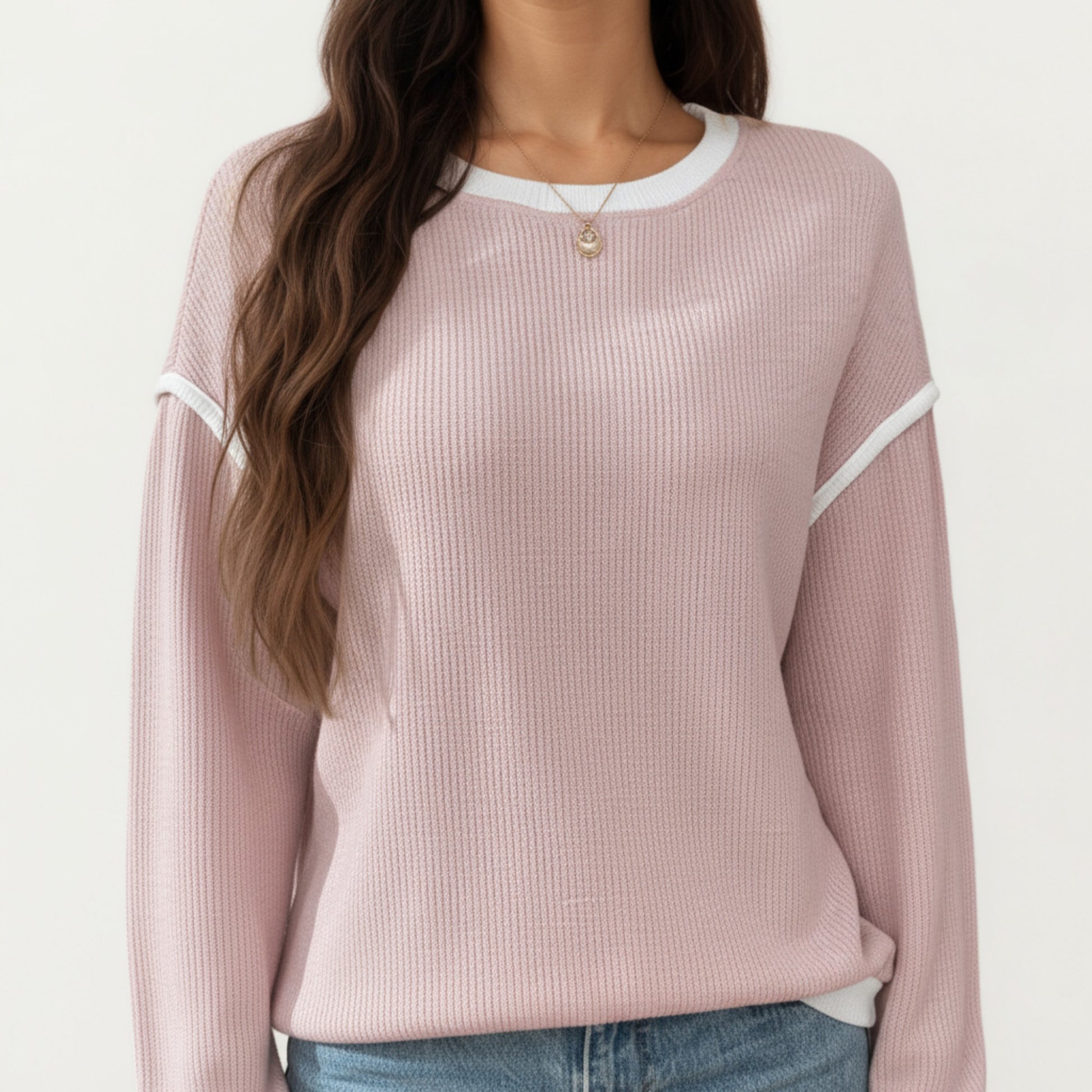 Long Sleeve Knit Top with Contrast Trim and Relaxed Fit