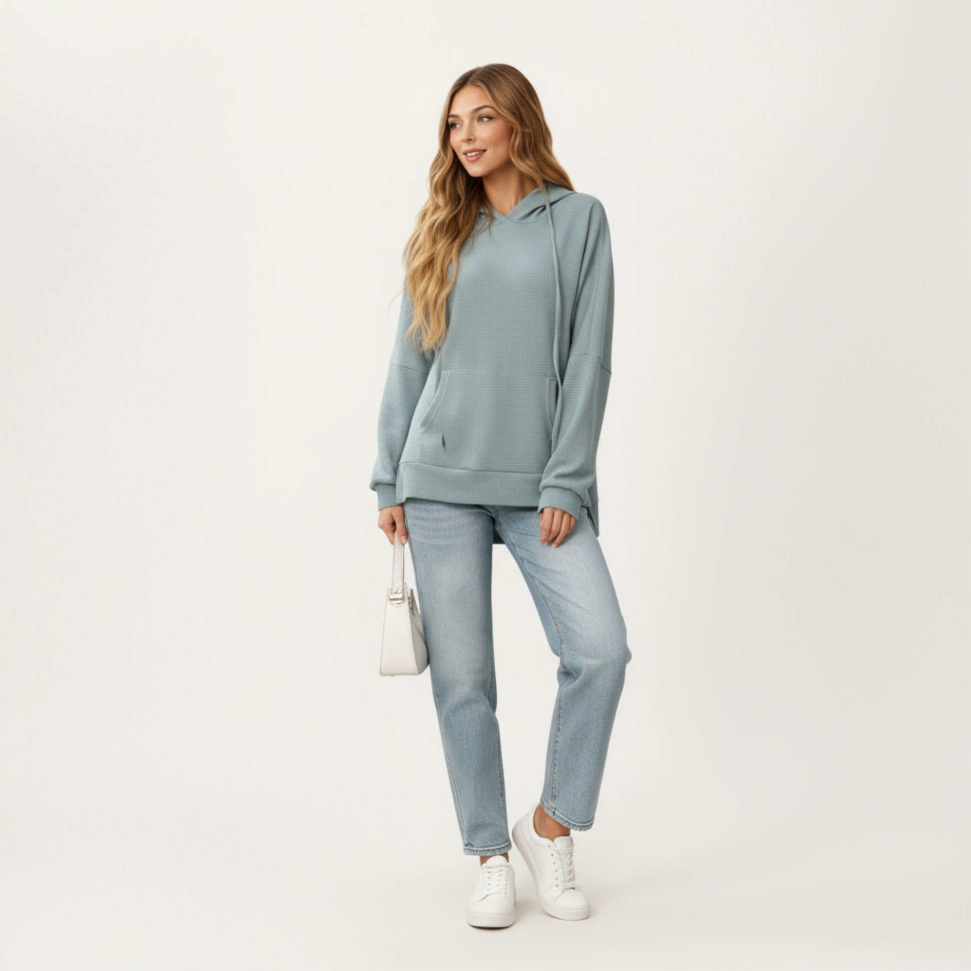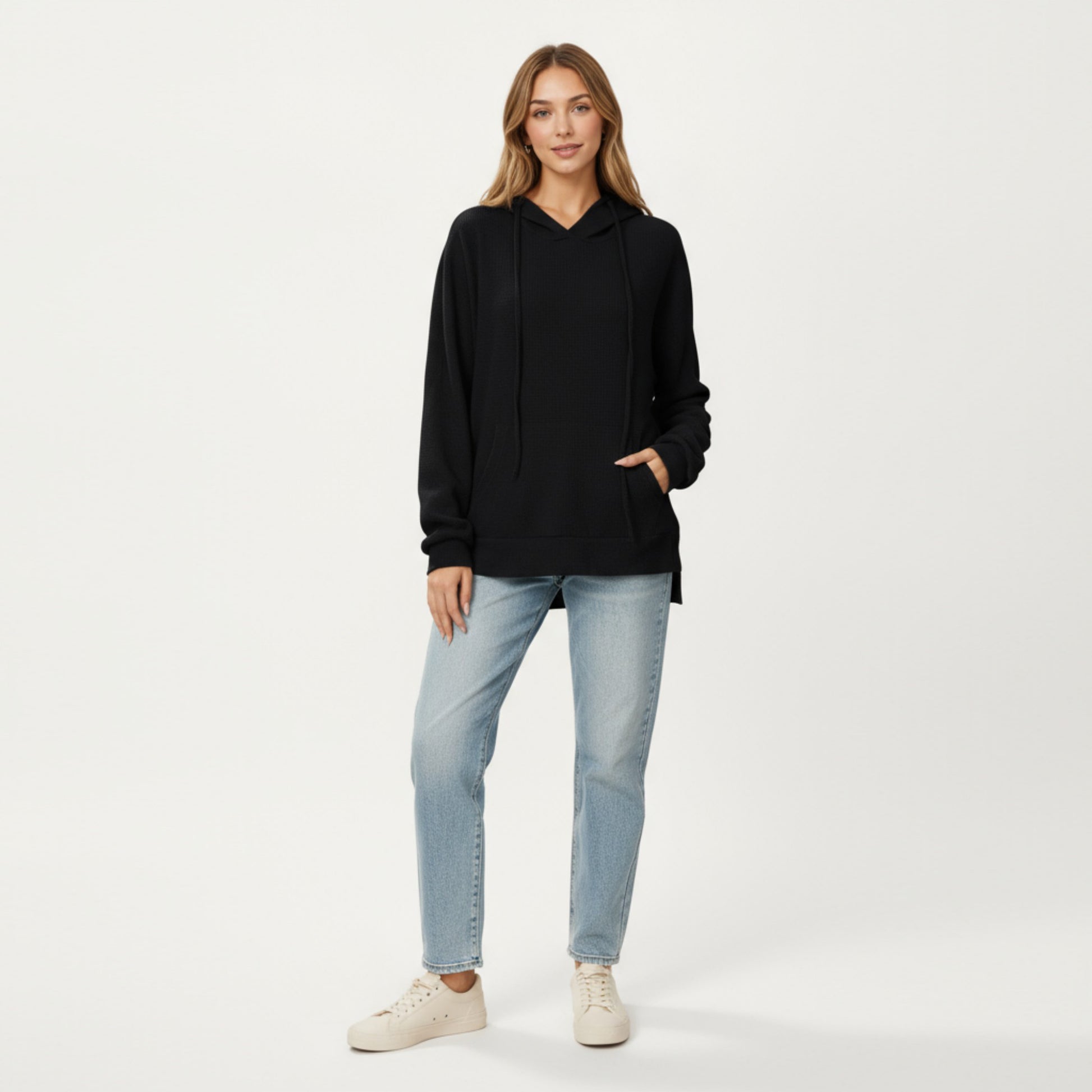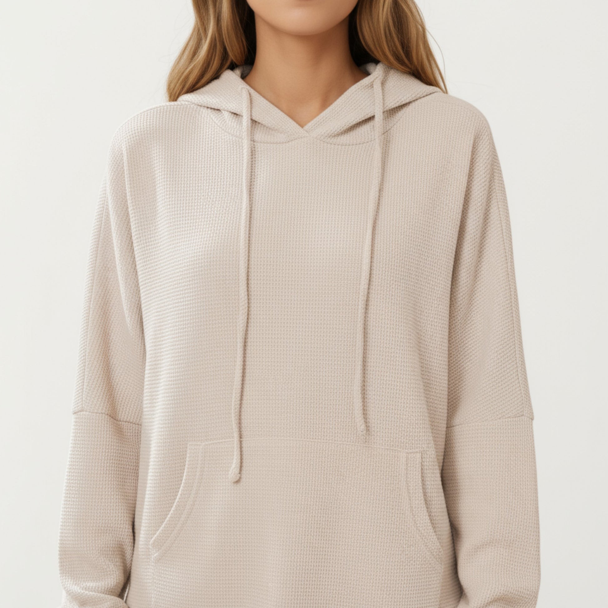 The Anna-Kaci Women's Long Sleeve Pullover Hoodie offers a relaxed fit with a classic drawstring hood and a convenient kangaroo pocket. Made from soft, midweight fabric, this hoodie provides cozy comfort while maintaining a casual, polished look. Perfect for layering, it pairs effortlessly with jeans, leggings, or joggers for a versatile wardrobe staple.