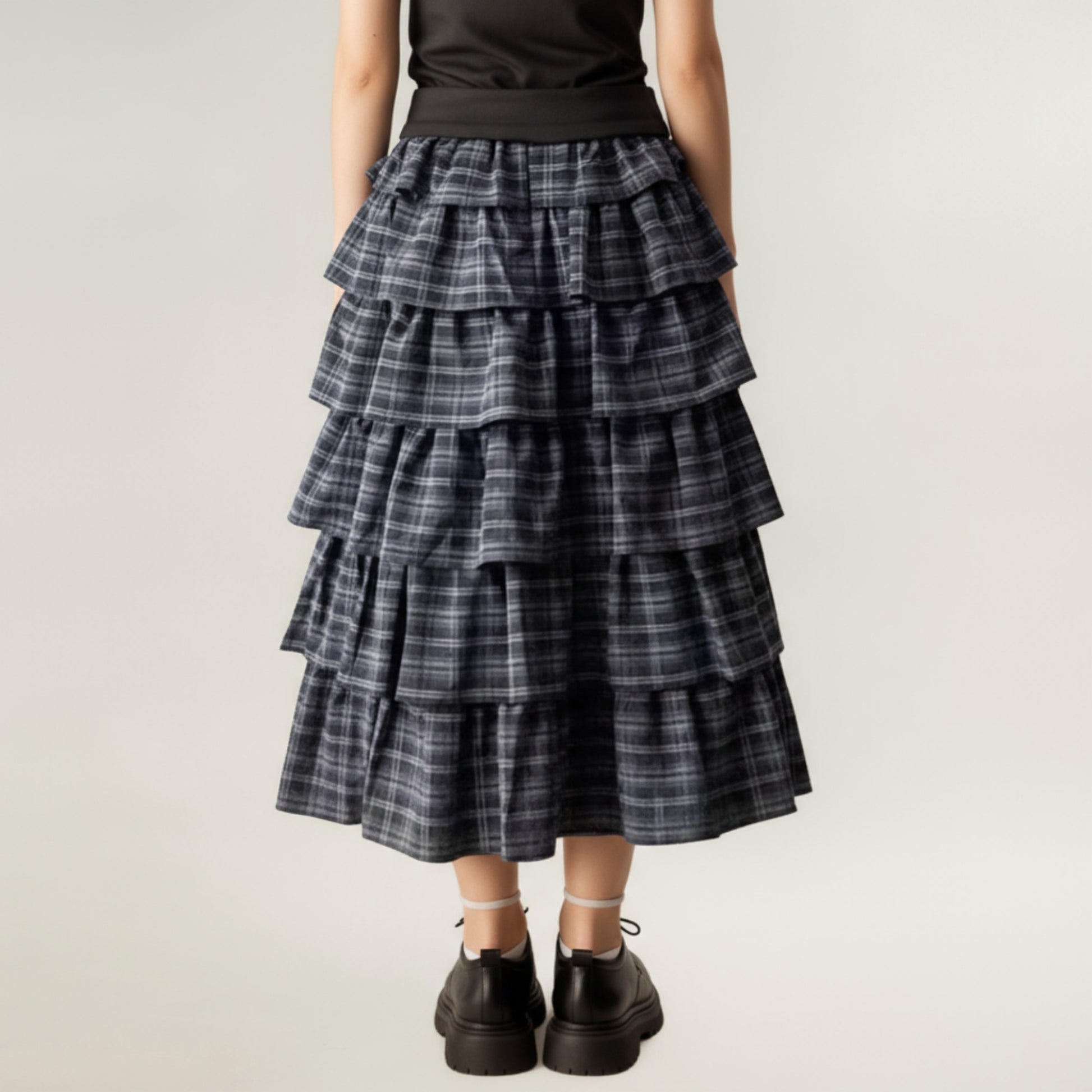 Tiered Plaid Maxi Skirt with Ruffle Layers and Elastic Waistband