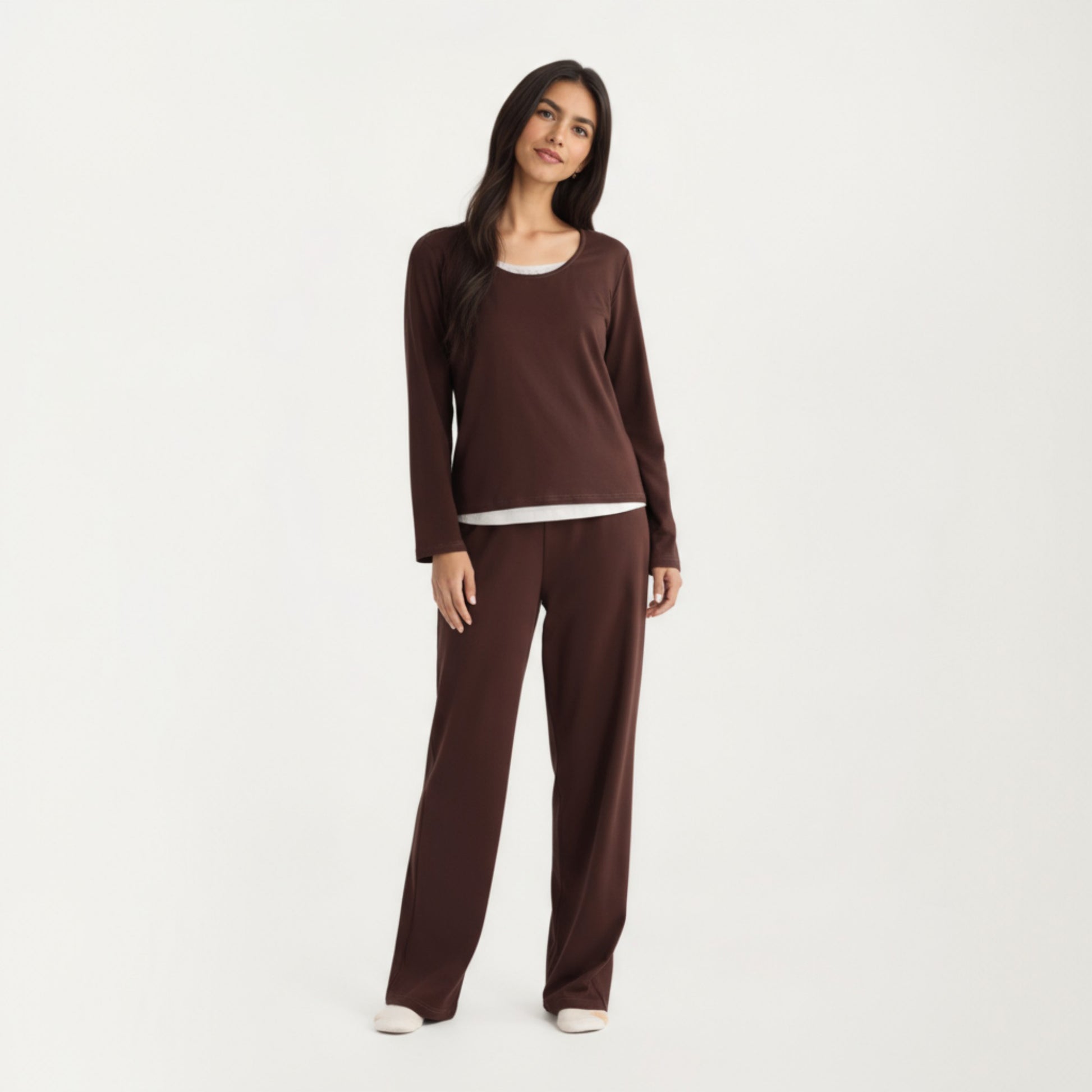 The Anna-Kaci Women's 2-Piece Set Soft Knit Long Sleeve Top and Relaxed Fit Lounge Pants combines simplicity and comfort for effortless everyday wear. Designed with a smooth, soft-touch knit fabric, this matching set features a classic long sleeve top with a scoop neckline and flowy straight-leg pants. The relaxed silhouette allows for easy movement and all-day comfort, making it ideal for lounging or casual at-home moments. A perfect balance of cozy and chic, this set brings refined ease to your wardrobe.