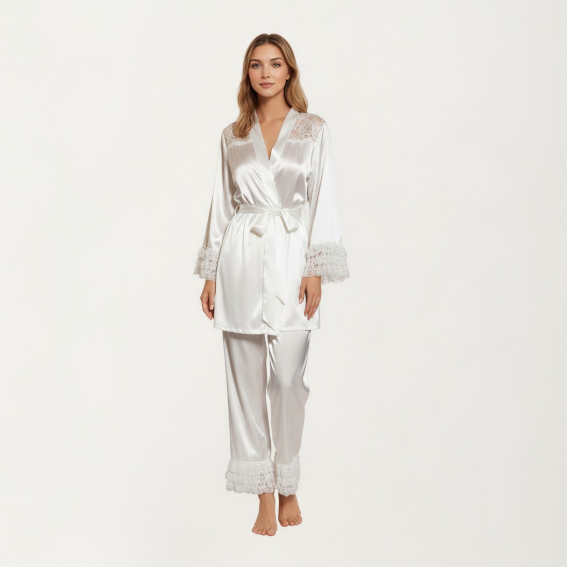 The Anna-Kaci Women's 2-Piece Set Satin Lace Trim Long Sleeve Top with Tie Waist and Ruffle Hem Pants exudes sophistication and comfort. Crafted from smooth satin fabric, the wrap-style top features delicate lace detailing and a waist tie for a flattering silhouette. Matching straight-leg pants with ruffled hems add a touch of elegance, creating a luxurious lounge look that feels as stunning as it appears.