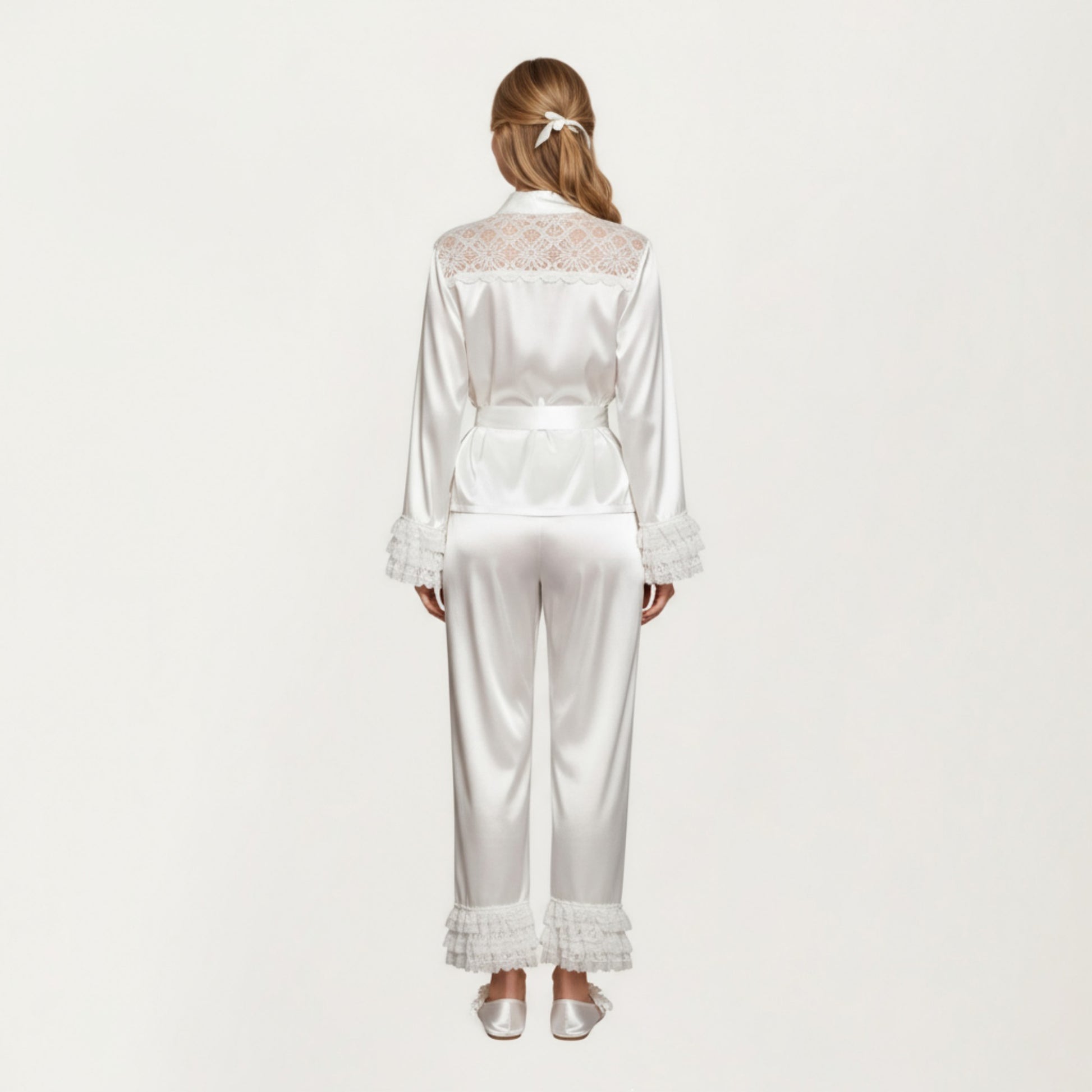 2-Piece Set Satin Lace Trim Long Sleeve Top with Tie Waist and Ruffle Hem Pants