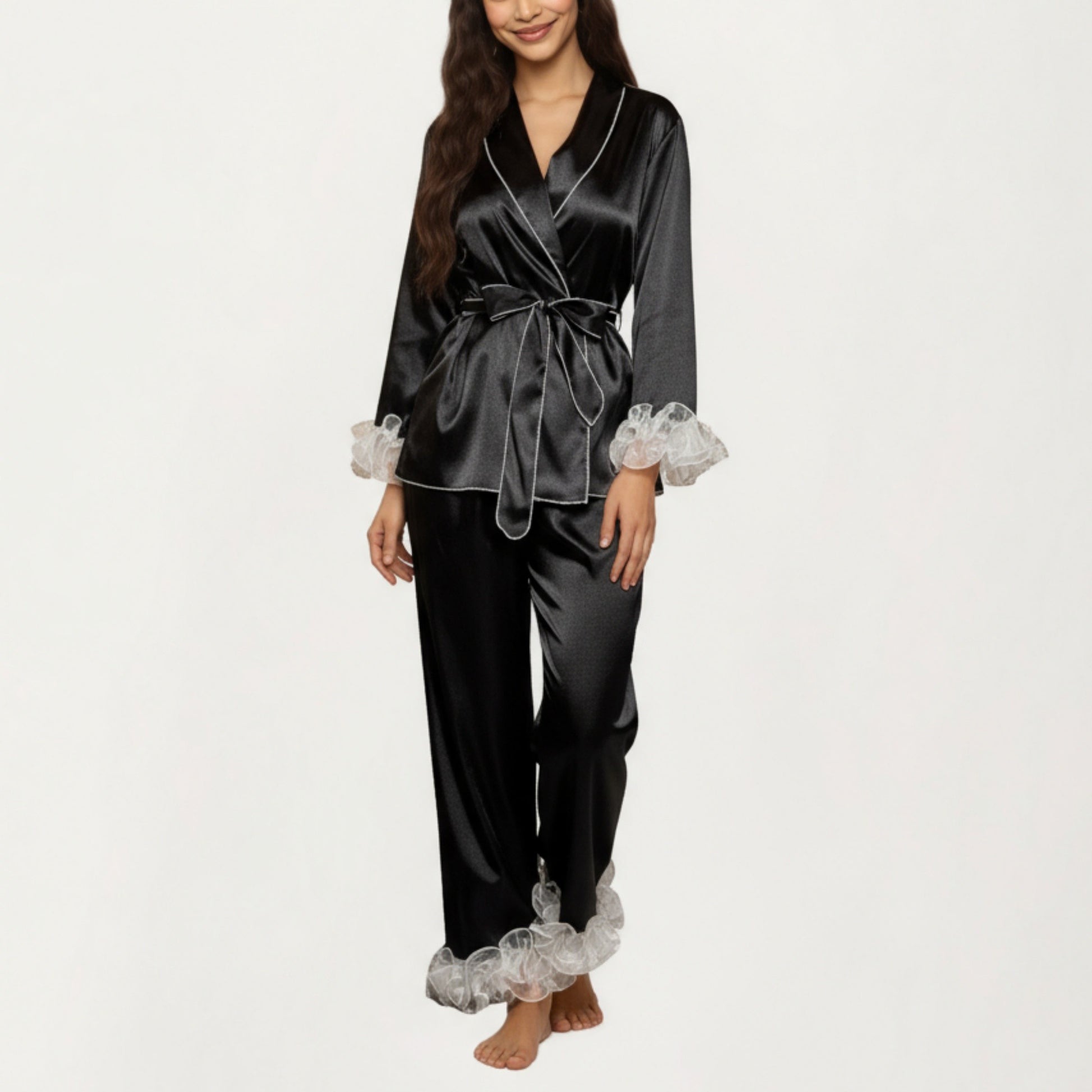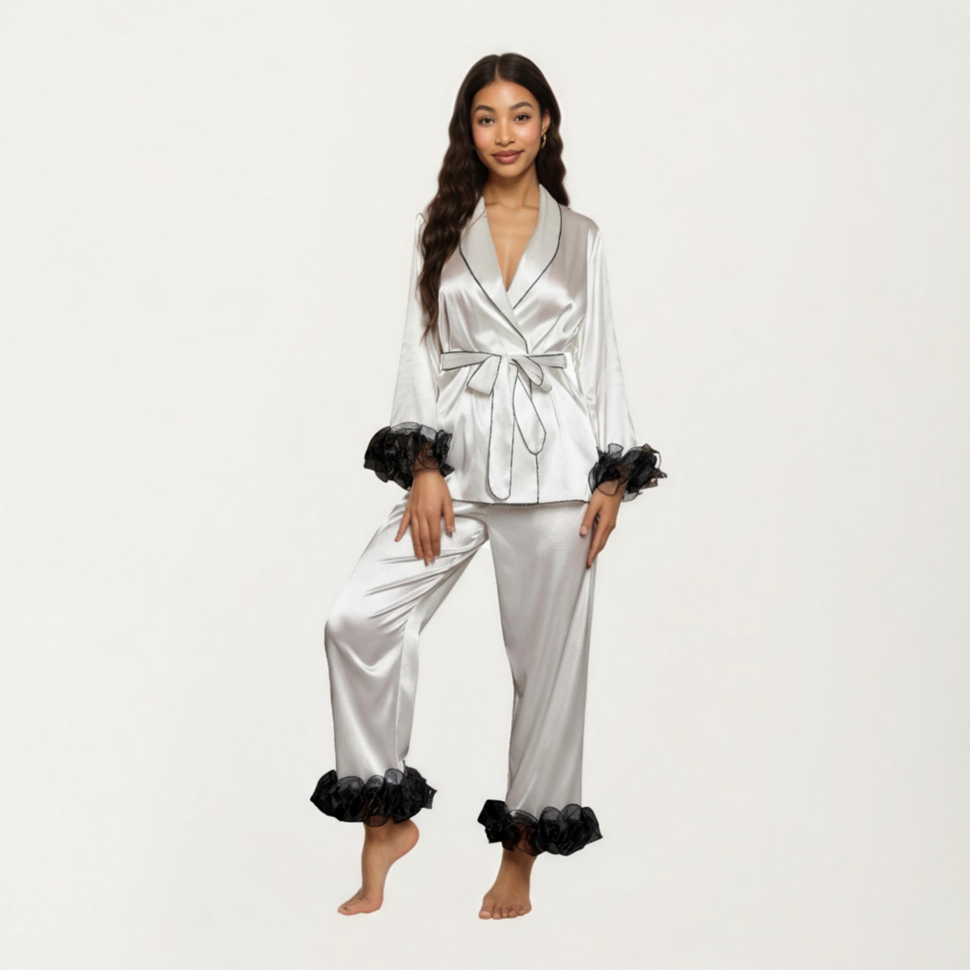 The Anna-Kaci Women's 2-Piece Set Satin Wrap Top with Sheer Ruffle Trim and Matching Straight-Leg Pants adds a playful yet elegant twist to classic loungewear. Crafted from smooth, glossy satin, this set features a wrap-style top with a tie waist and contrast piping for a refined touch. Sheer ruffle trims at the cuffs and pant hems bring a feminine, flirty detail that enhances its sophisticated silhouette while maintaining luxurious comfort.