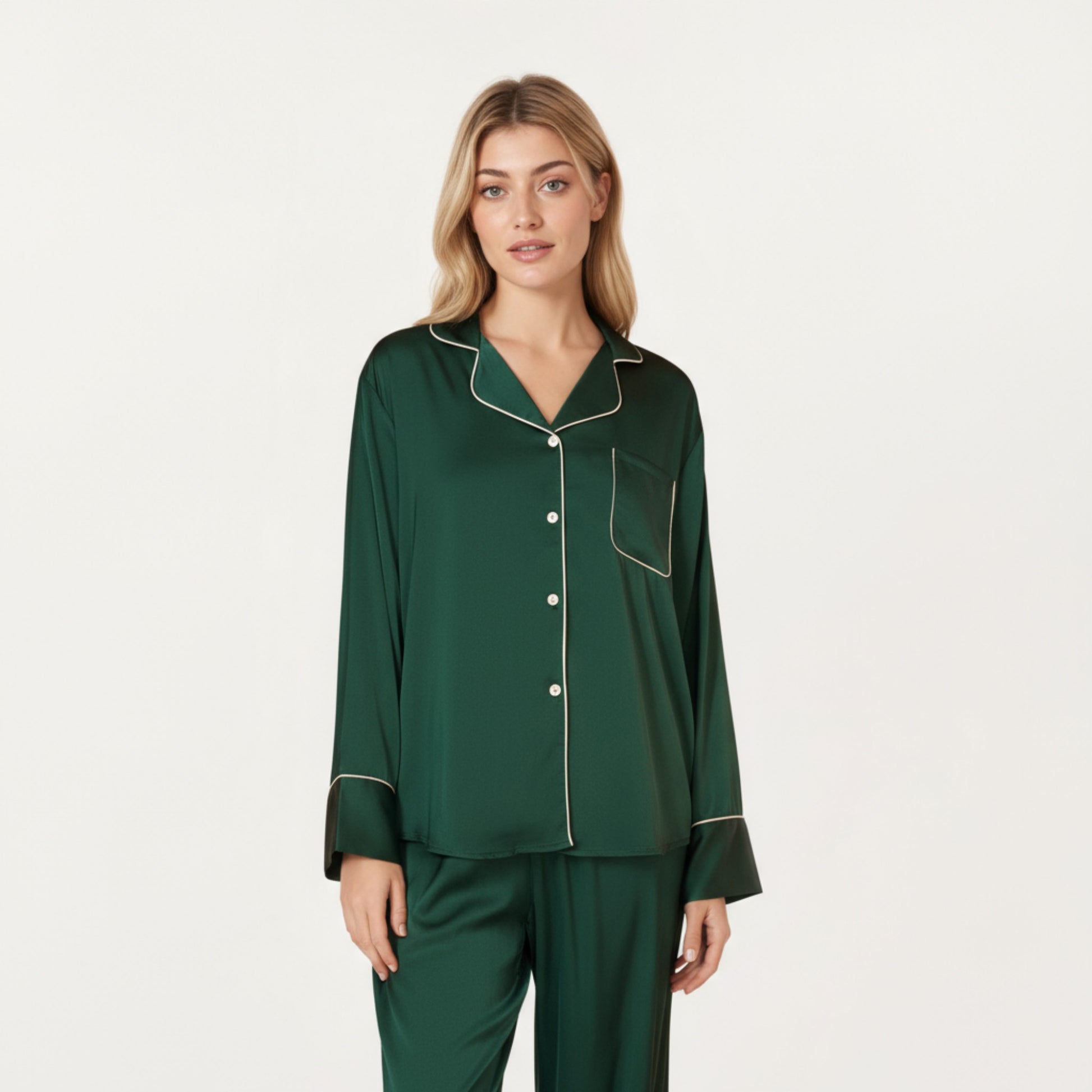 The Anna-Kaci Women's 2-Piece Satin Pajama Set with Button-Down Long Sleeve Top and Piped Trim Wide-Leg Pants blends timeless elegance with silky comfort. Crafted from smooth satin fabric, this classic pajama set features contrast piping, a relaxed button-front shirt, and matching pants with a drawstring waist. Designed for a soft, fluid drape, it delivers an effortlessly luxurious look and feel.