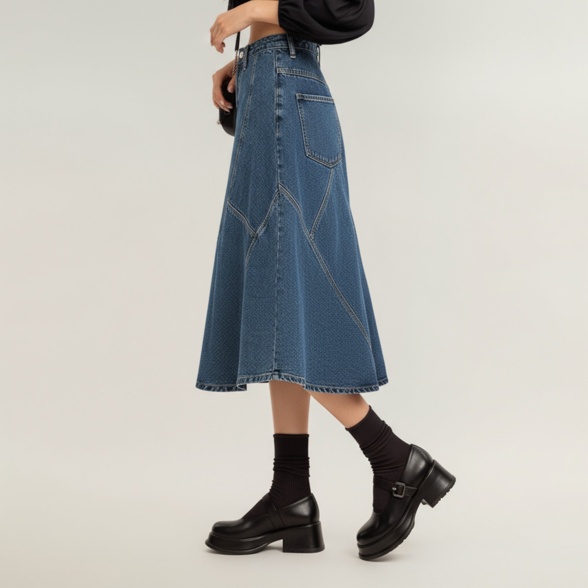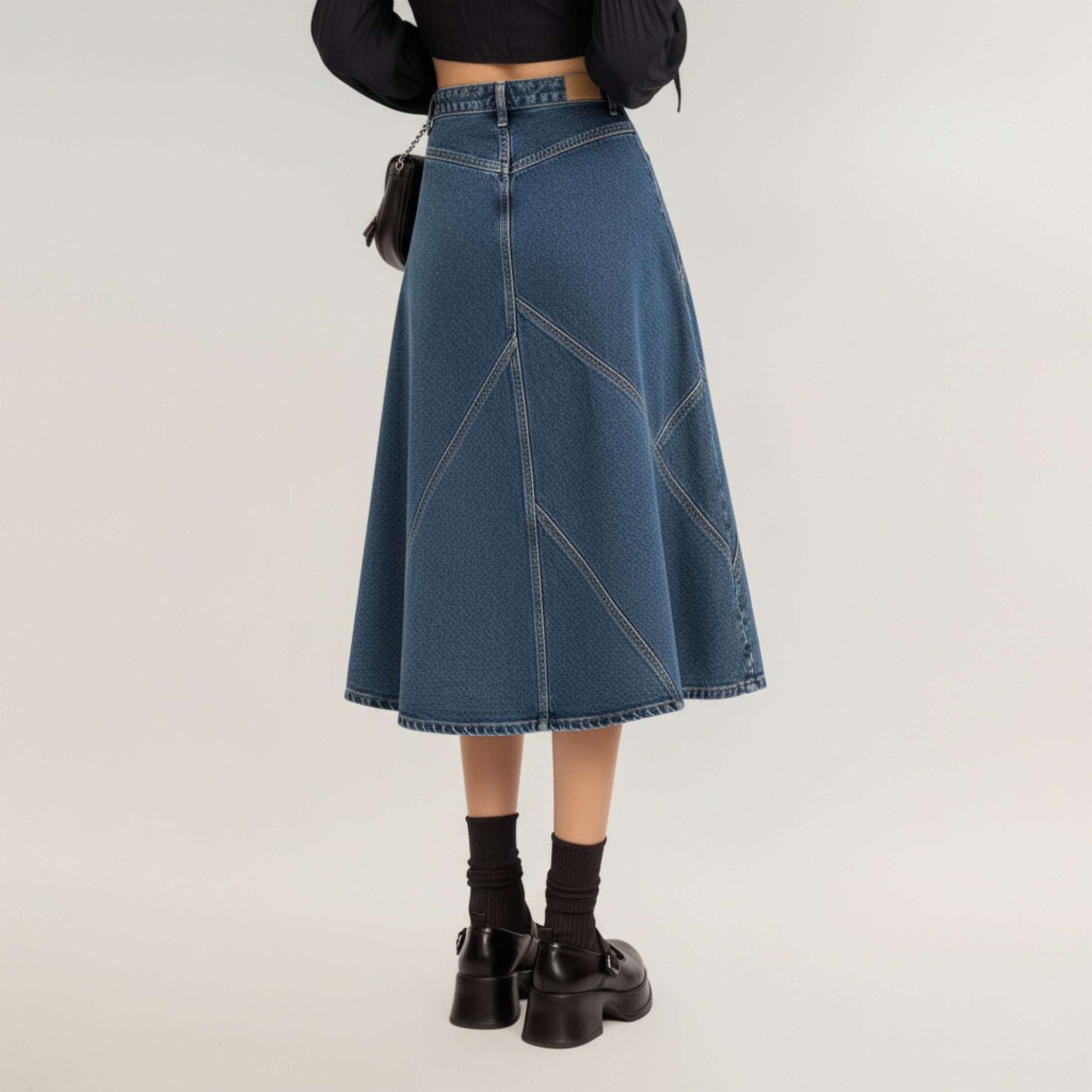 High Waist Denim Midi Skirt with Patchwork Seam Detailing and Flared Silhouette