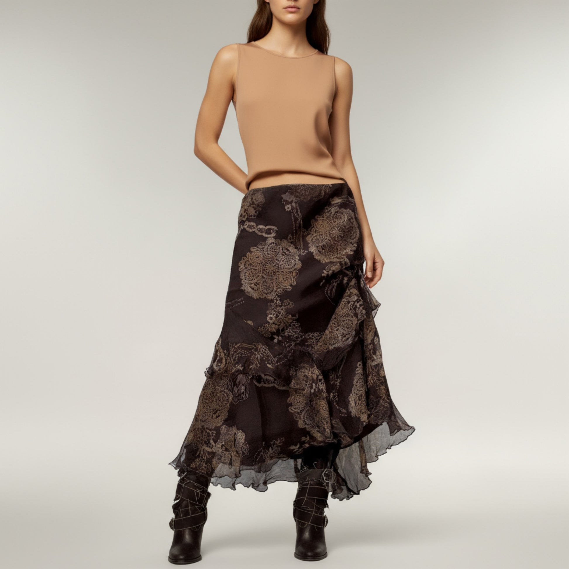 Bohemian Asymmetrical Midi Skirt with Ruffled Hem and Vintage Lace Print