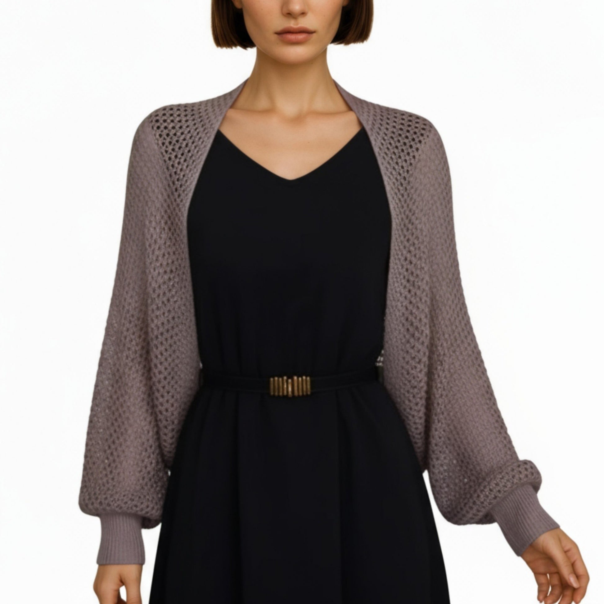 Open Knit Shrug Cardigan with Long Balloon Sleeves and Ribbed Cuffs