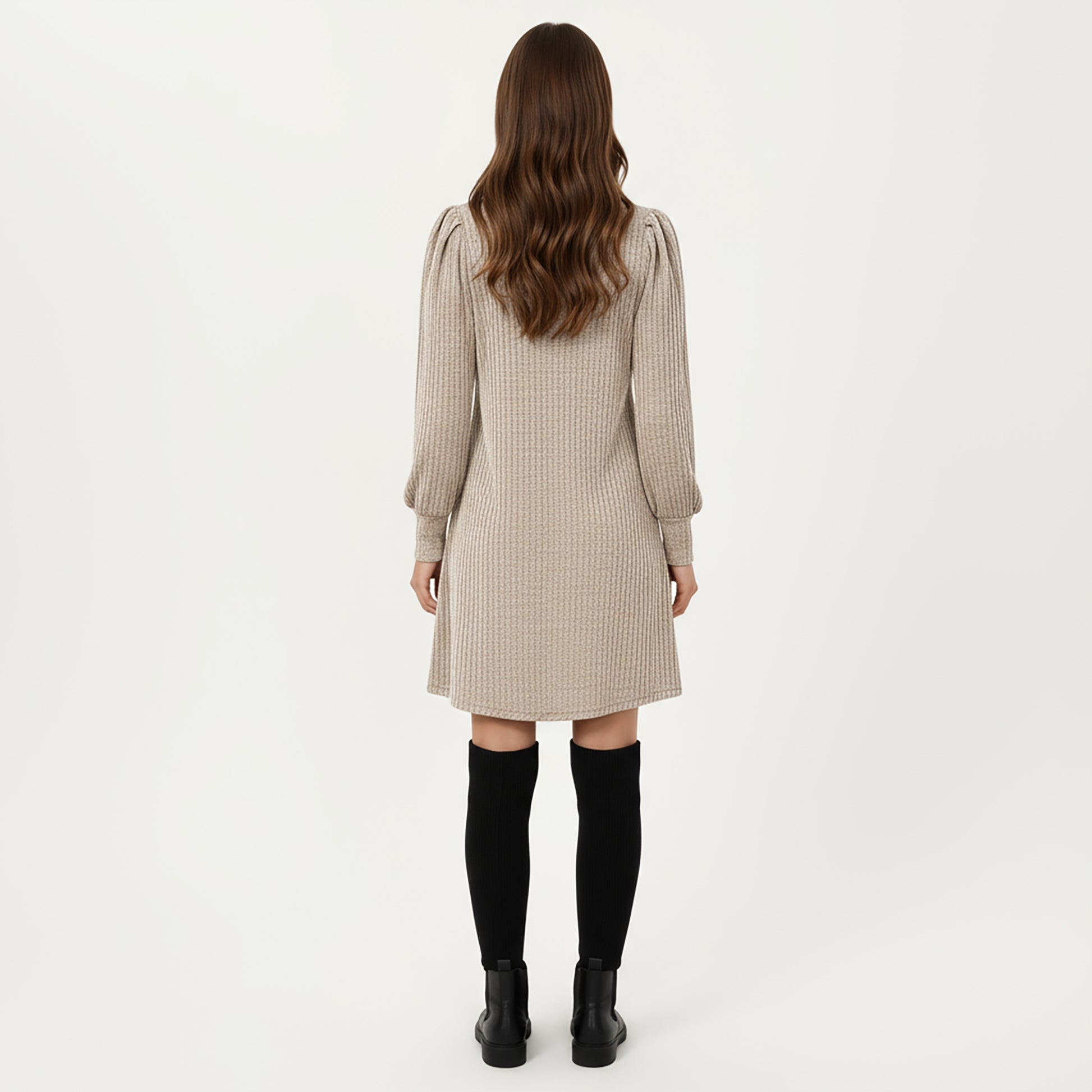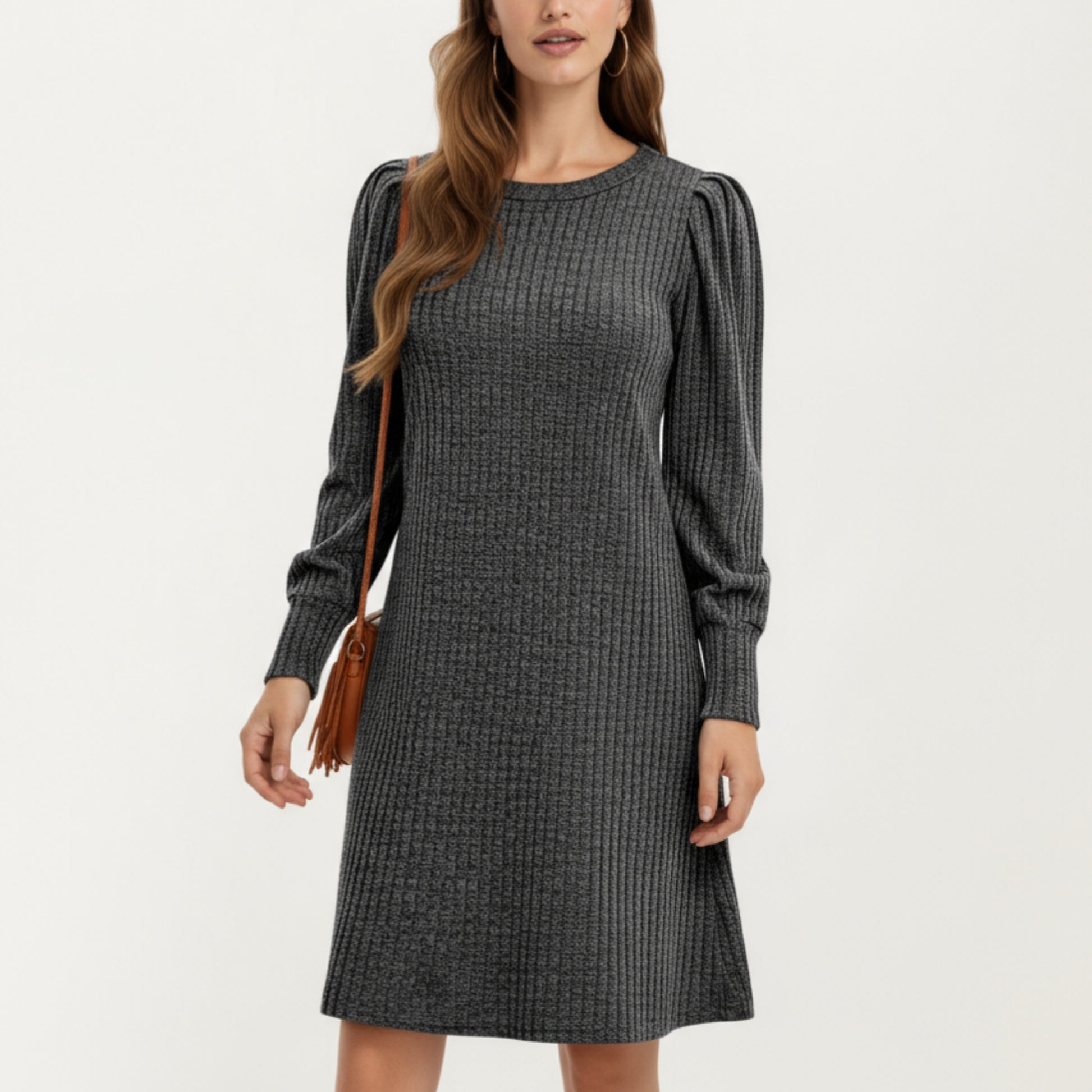 Ribbed Knit Long Sleeve Dress with Puff Shoulder Detail and Relaxed A-Line Silhouette
