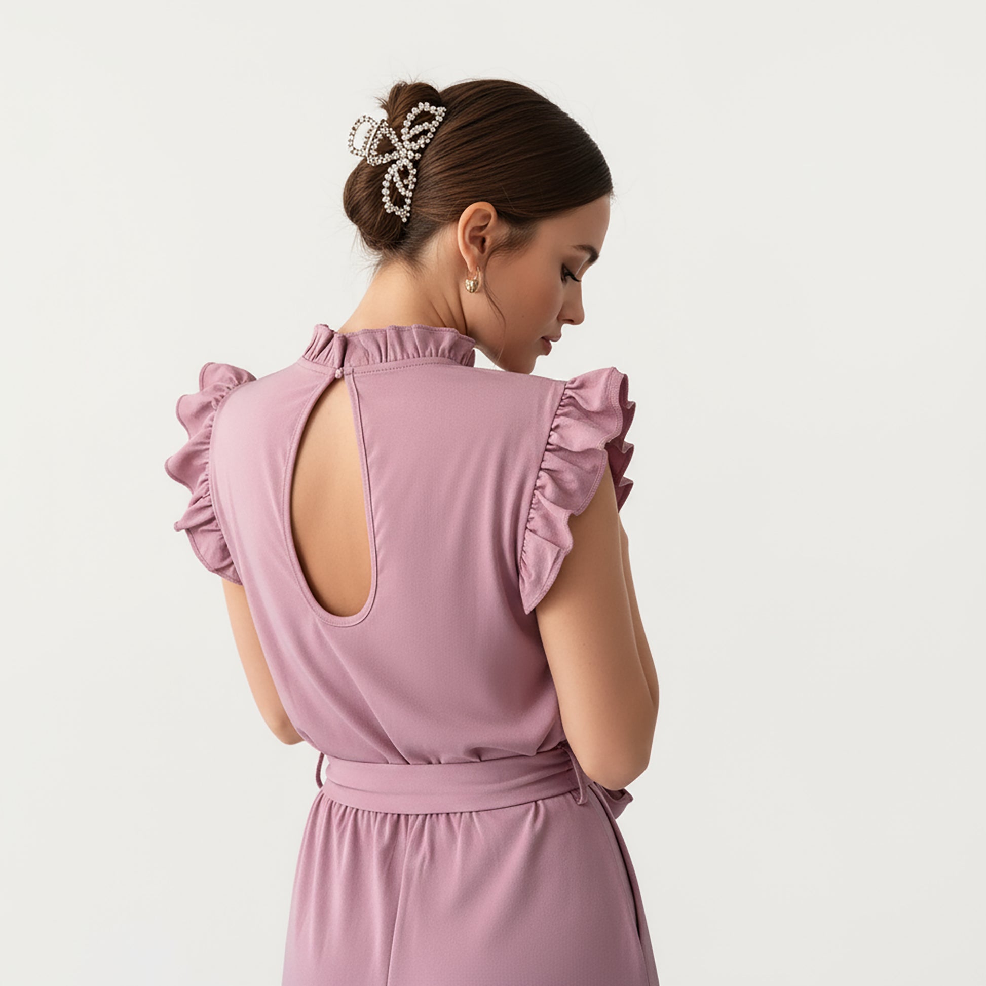 Ruffle Neck Sleeveless Wide Leg Jumpsuit with Soft Draped Waist Tie and Relaxed Flowing Silhouette