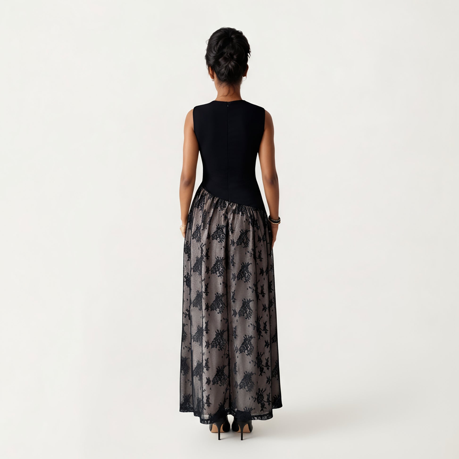 Sleeveless Maxi Dress with Fitted Square Neck Bodice, Asymmetrical Waist Seam, and Sheer Patterned Overlay Dress