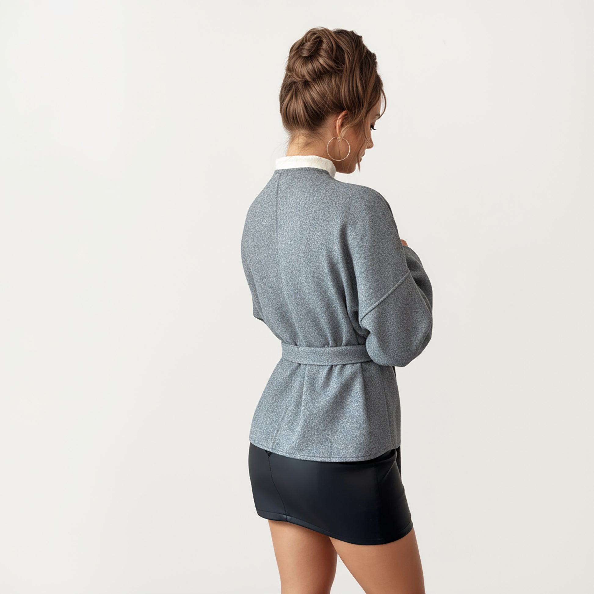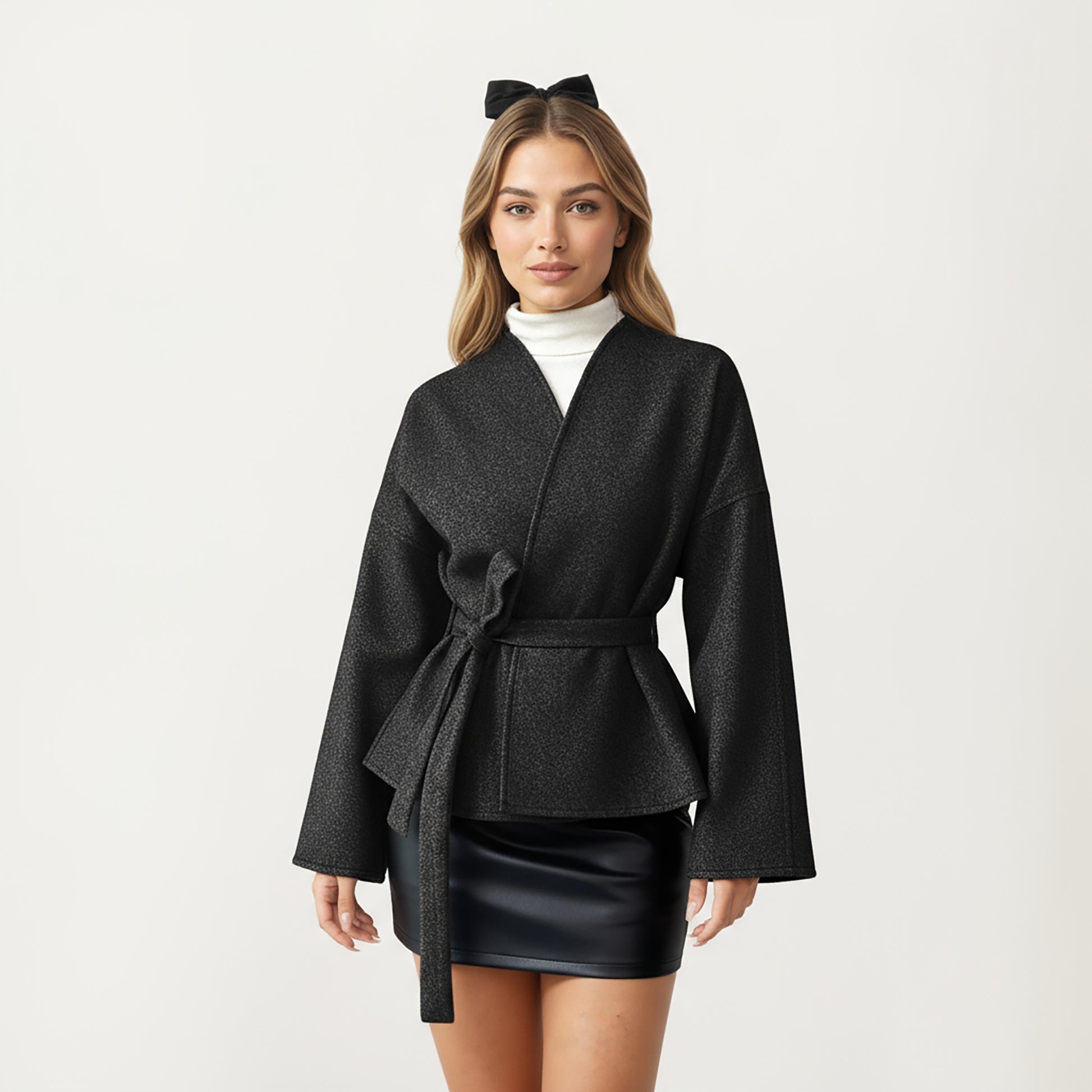 Wrap Front Belted Jacket with Soft Textured Fabric, Wide Sleeves, and Structured Peplum Shape