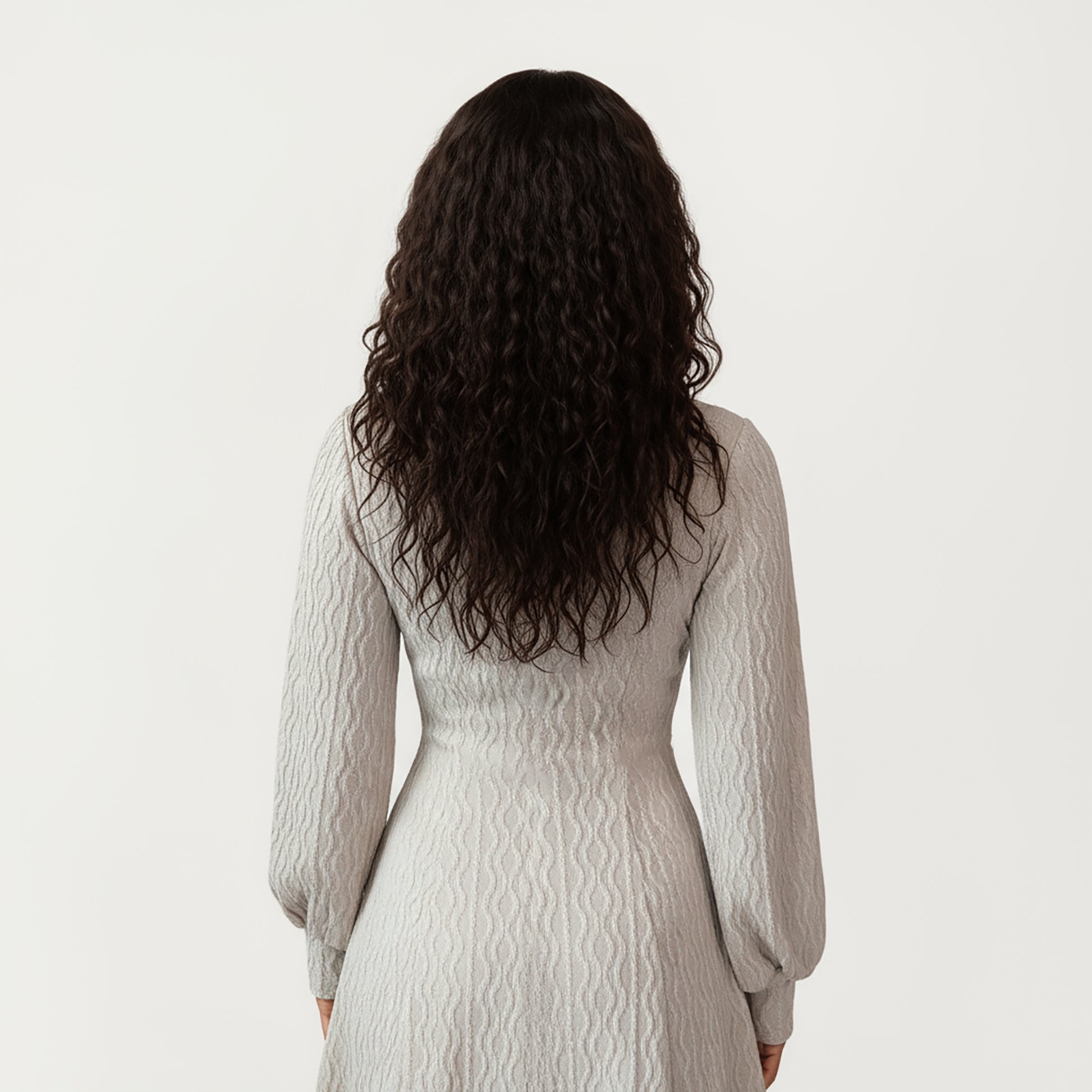 This Anna-Kaci Women¡¯s dress features a textured knit surface with a subtle flowing pattern that adds depth and soft visual movement throughout the silhouette. The V-neckline is cleanly shaped, creating a smooth, refined frame at the top. Long sleeves with gathered volume and fitted cuffs add gentle structure, leading into a fit-and-flare body that creates a balanced, softly draped shape. The knit fabric offers a comfortable, flexible feel with a refined, polished finish.