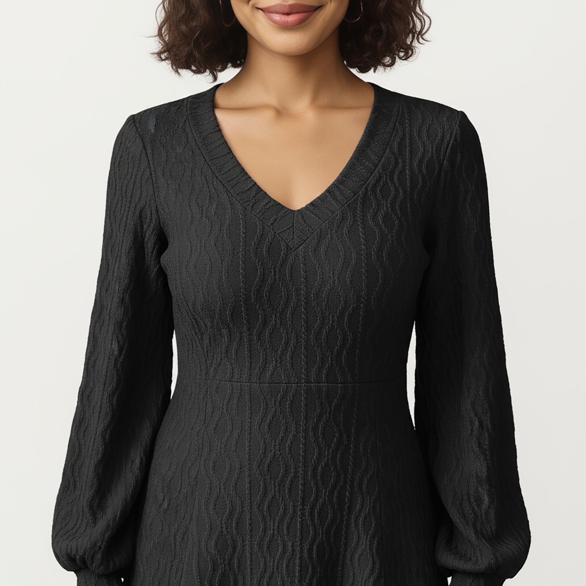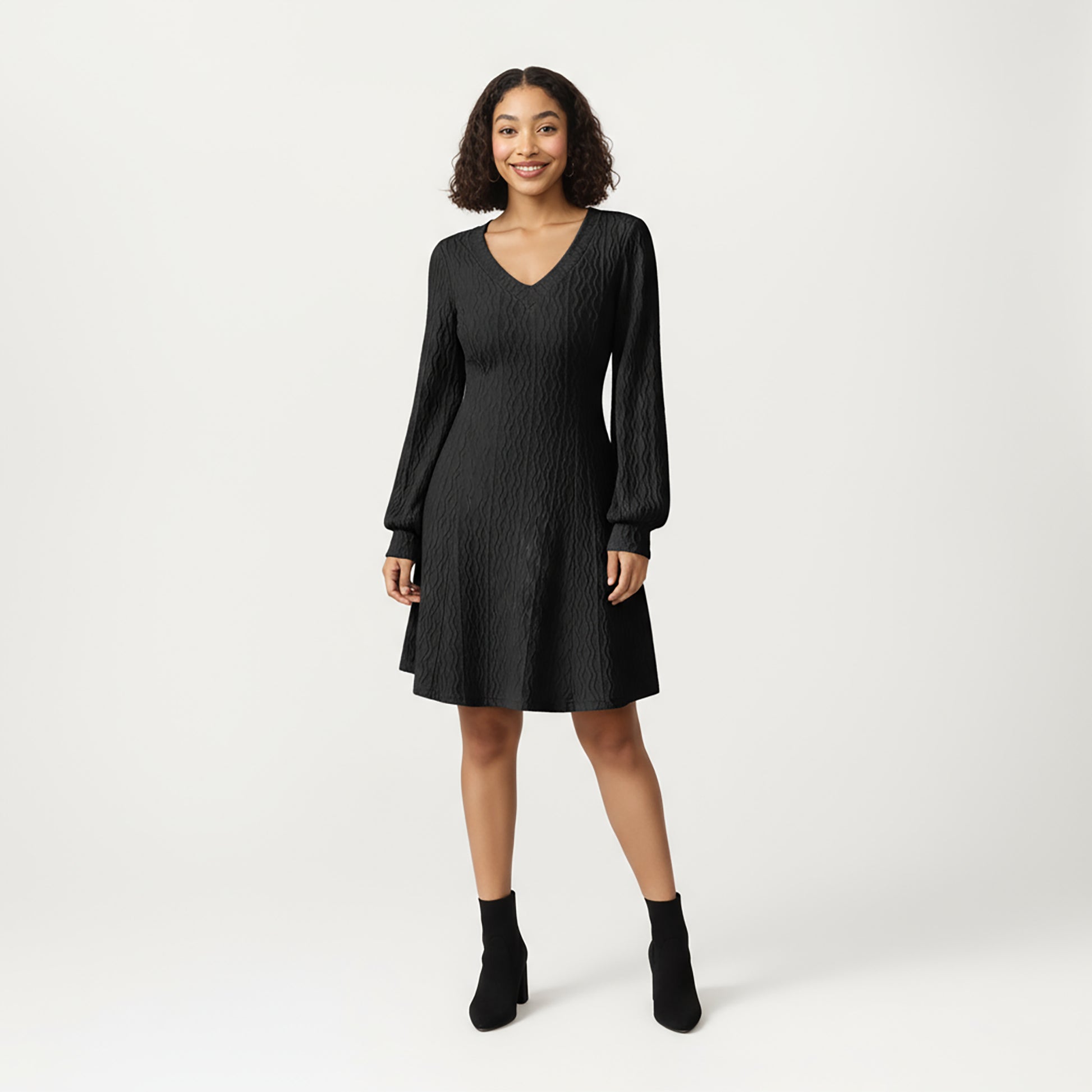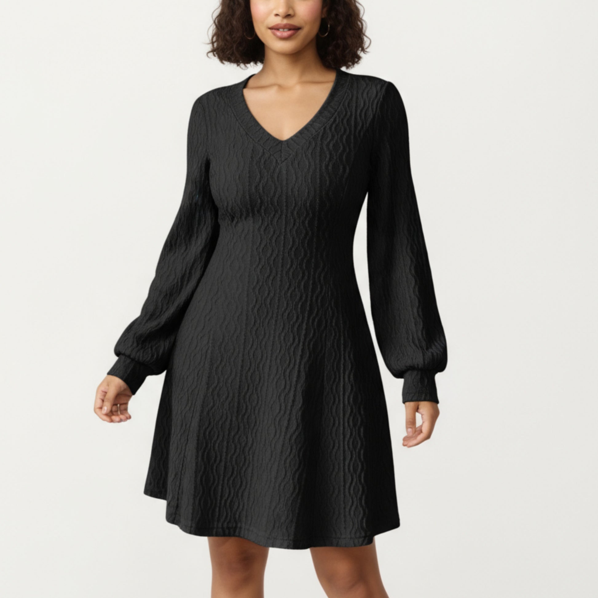 Textured Knit Long Sleeve V-Neck Fit-and-Flare Mini Dress with Soft Rib Detailing and Gentle Drape