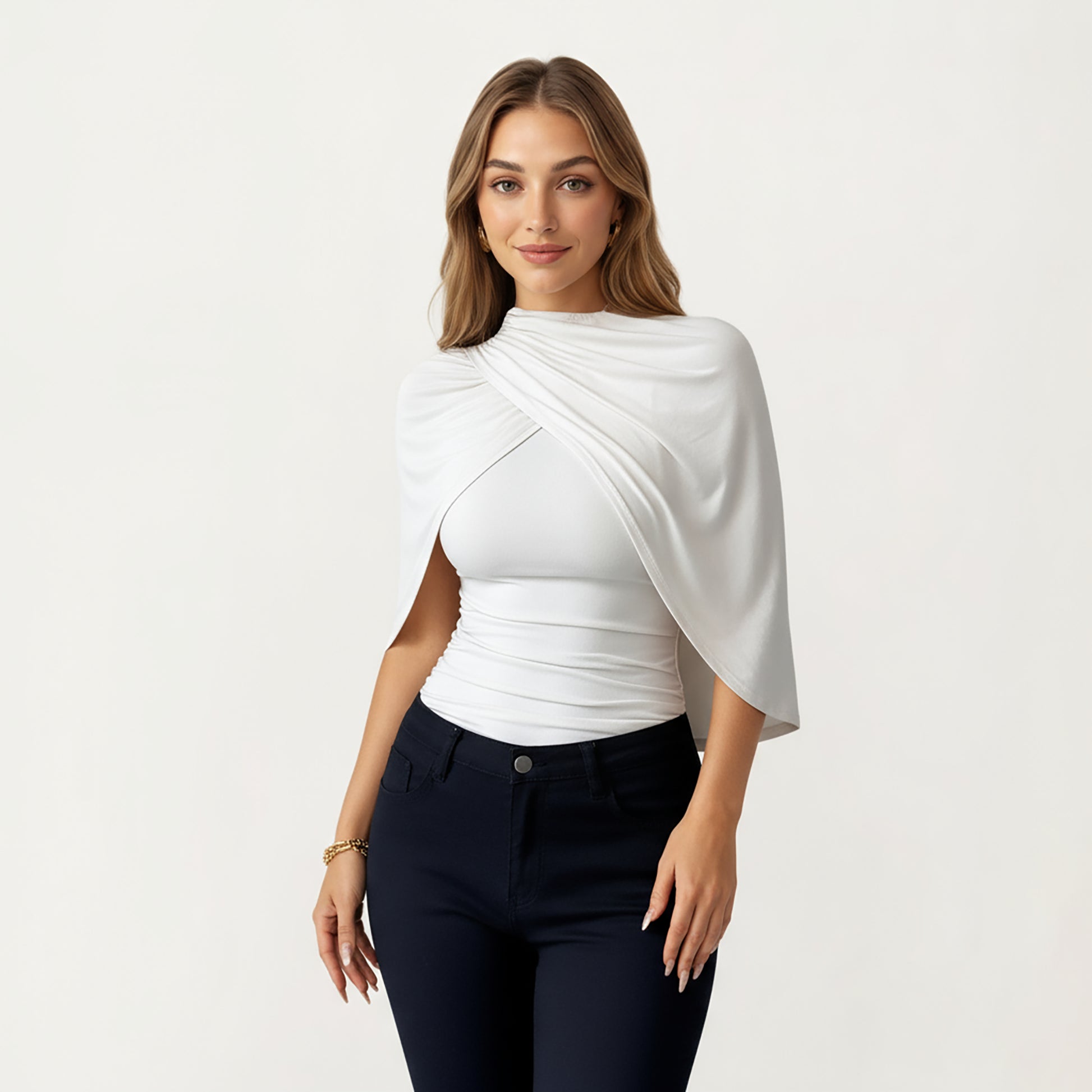 Draped Overlay Top with Gathered Shoulder Detail and Smooth Fitted Bodice Design