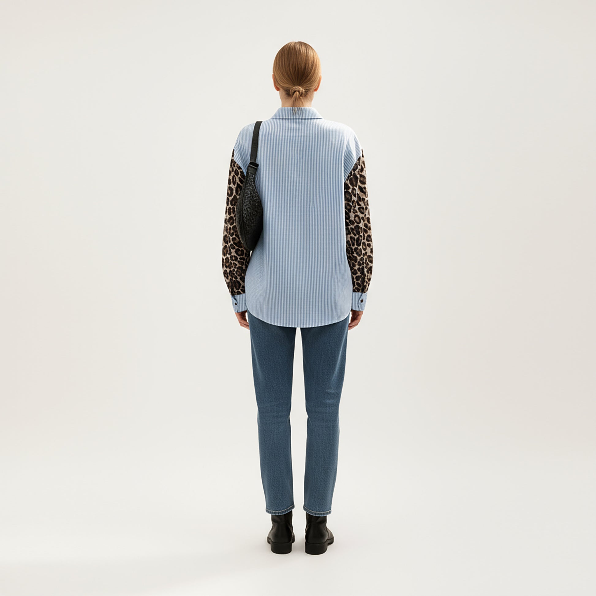 Long Sleeve Button-Up Shirt with Leopard Print Sleeves and Striped Pattern