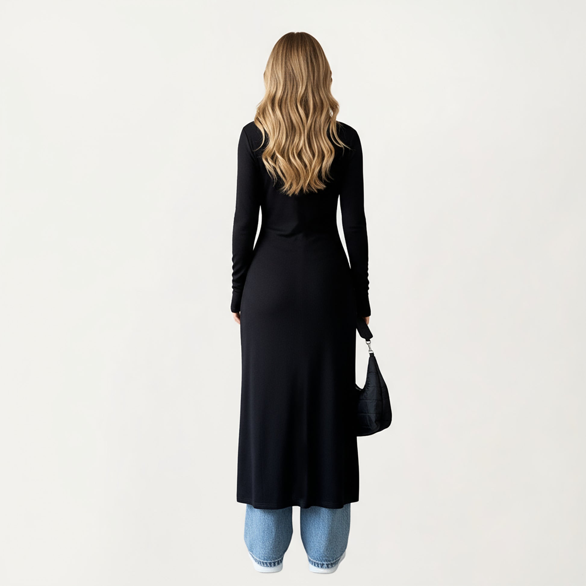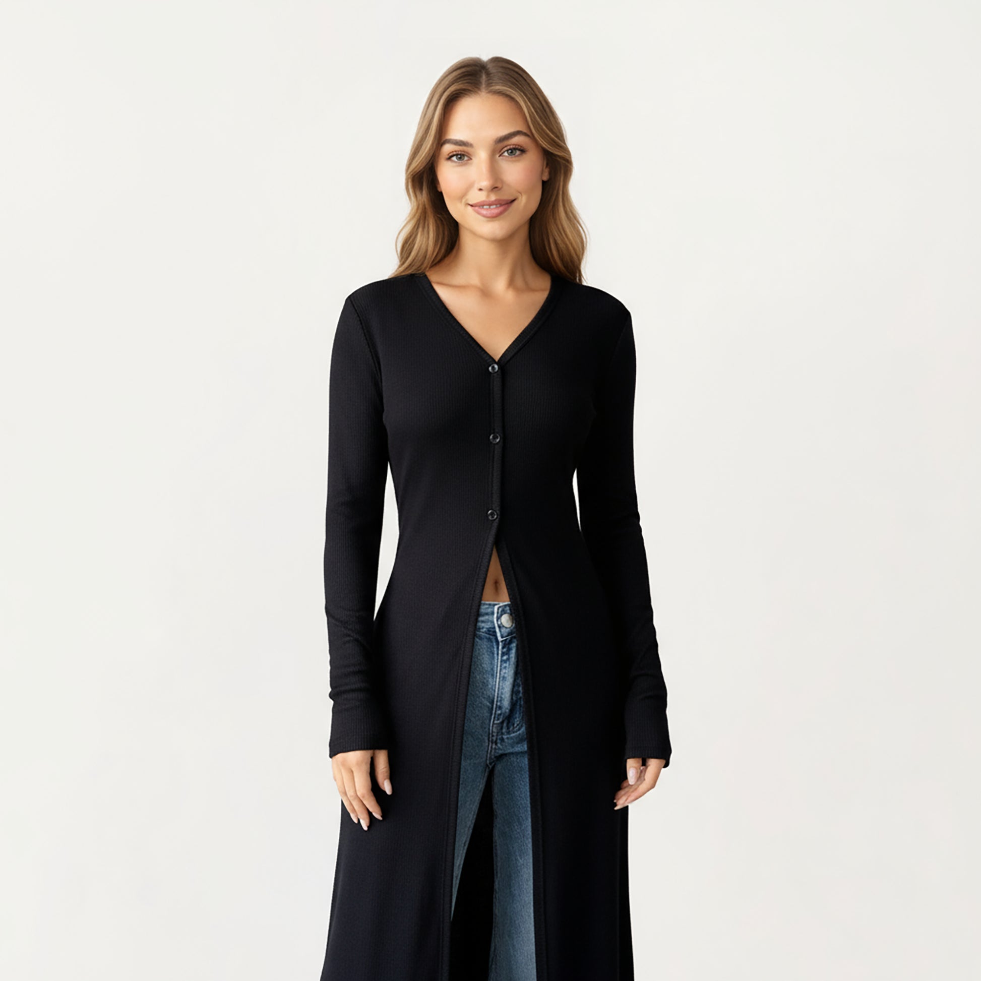 The Anna-Kaci Women's Long Sleeve Maxi Cardigan with Button Front and Deep Side Slit brings effortless sophistication to any casual look. Featuring a sleek, figure-flattering silhouette, this maxi-length cardigan adds modern elegance with its front button closure and flowing open slit design. The long sleeves provide a balanced contrast to its elongated shape, making it perfect for layering over crop tops, tanks, or bodysuits. Whether styled with jeans or trousers, this piece delivers refined versatility.