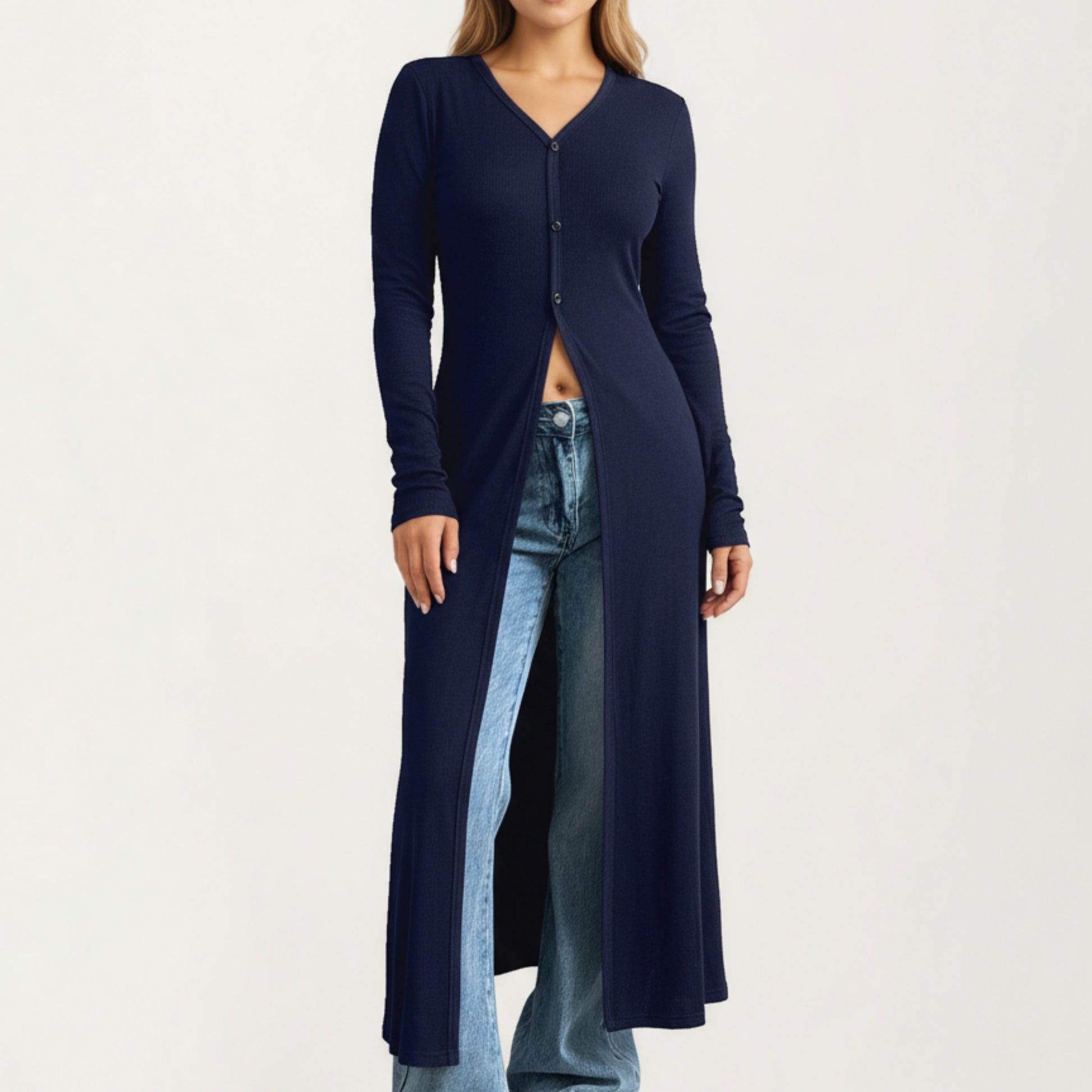 Long Sleeve Maxi Cardigan with Button Front and Deep Side Slit