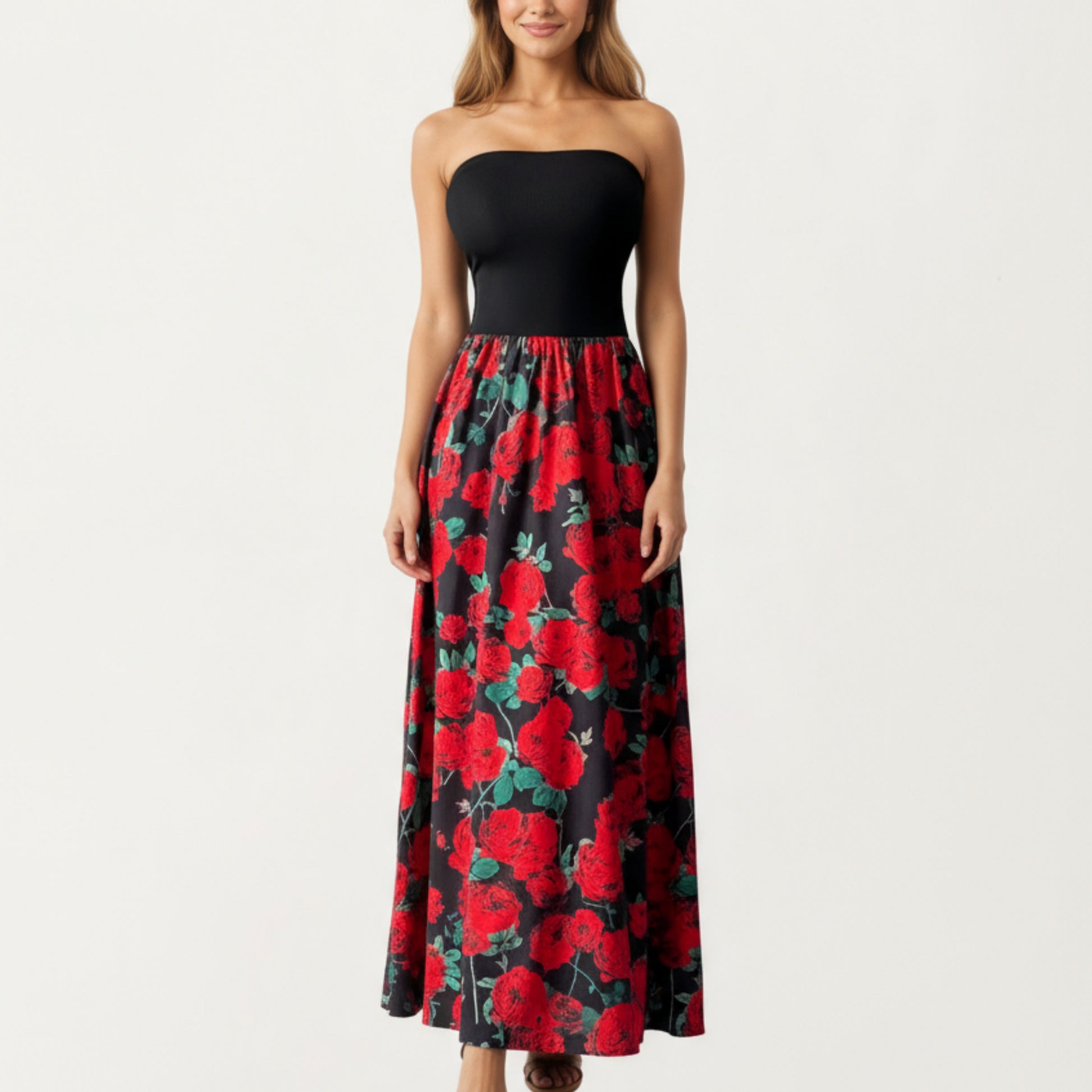 Strapless Maxi Dress with Fitted Bodice and Floral Print Skirt