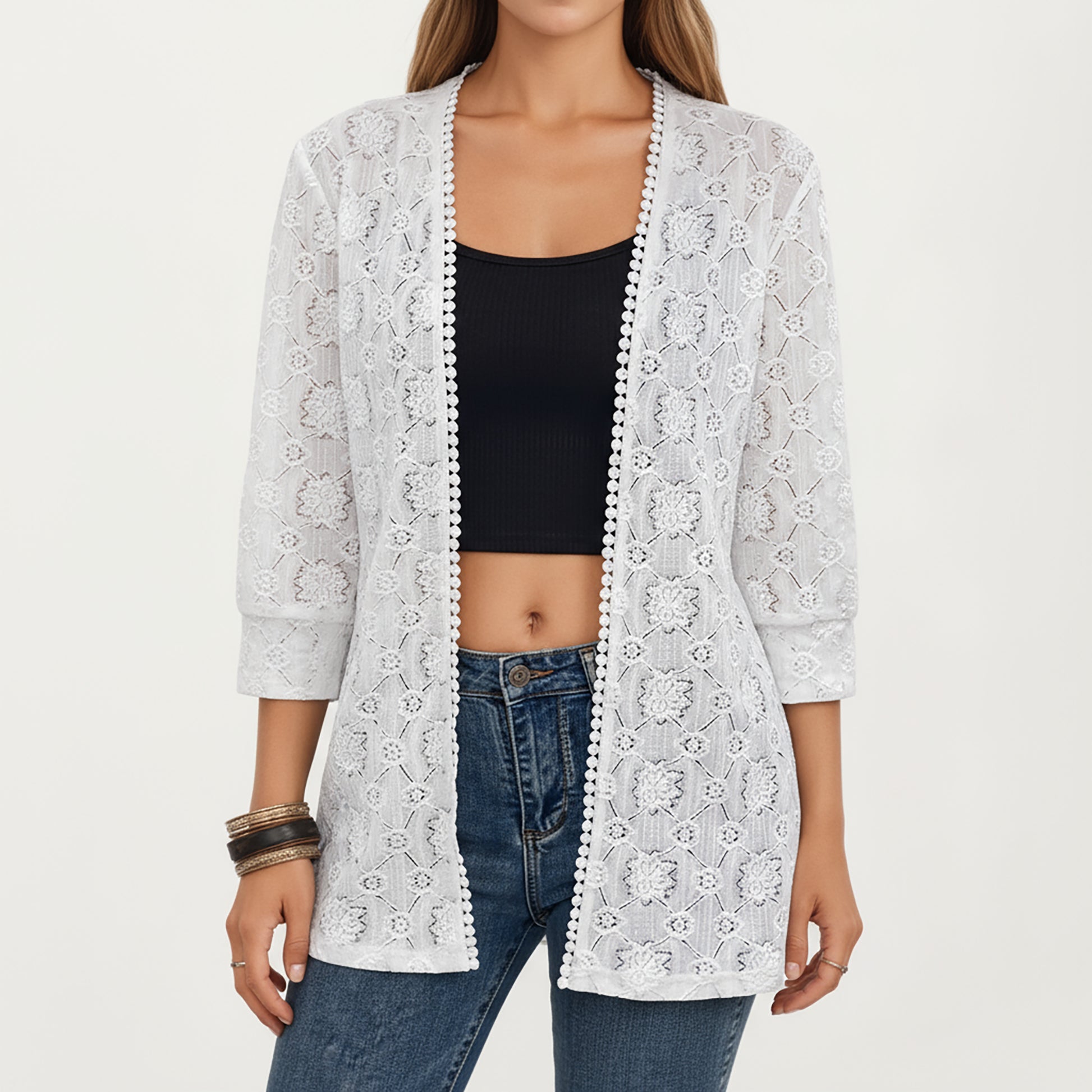 3/4 Sleeve Open Front Lace Kimono Cardigan with Floral Crochet Detailing