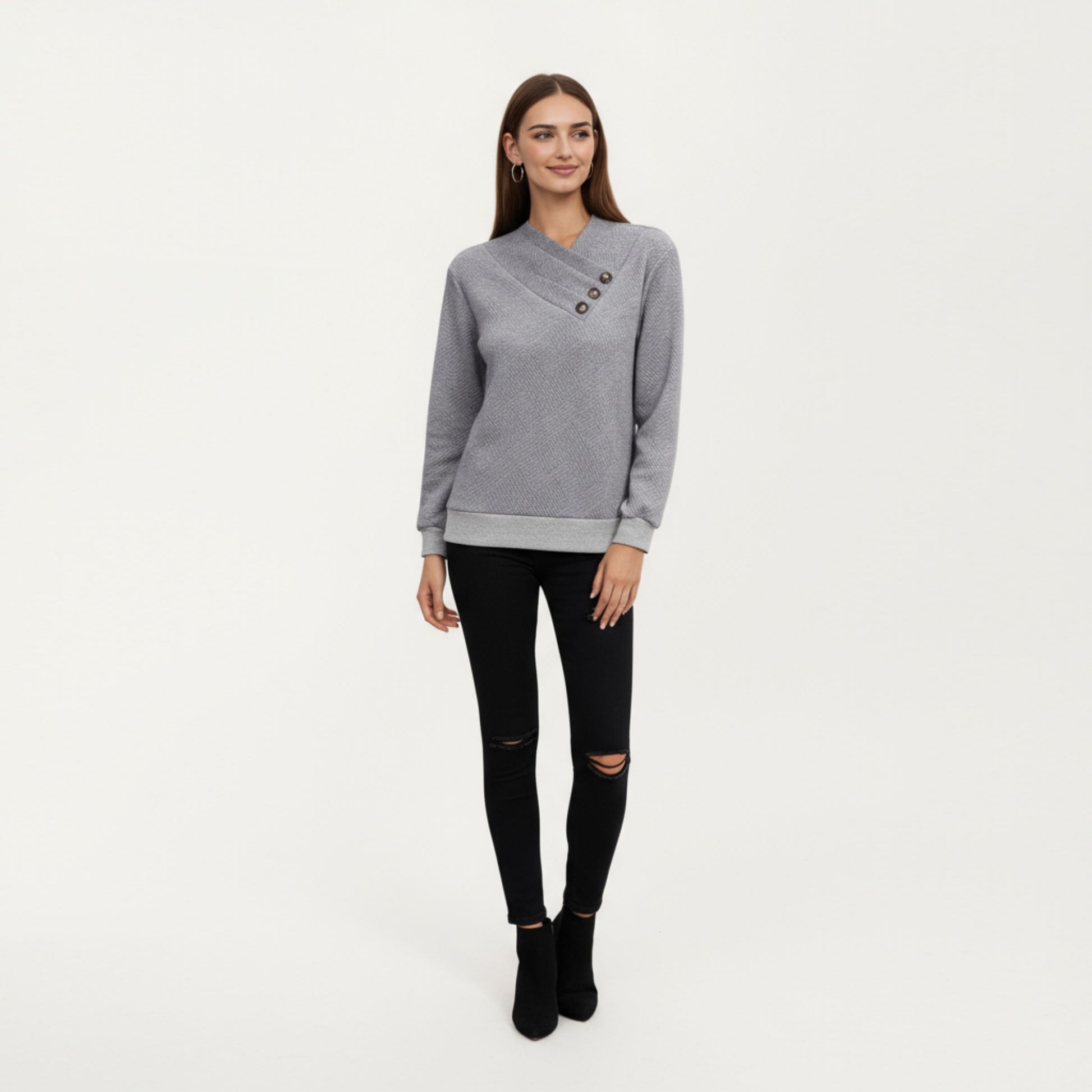 Long Sleeve Textured Knit Pullover Top with Asymmetrical Button Detail and Ribbed Hem