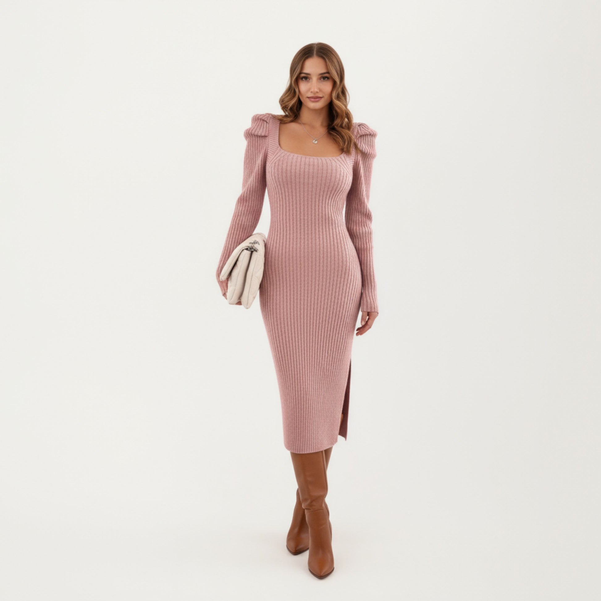 Long Sleeve Ribbed Knit Midi Dress with Square Neckline and Shoulder Ruffle Detail