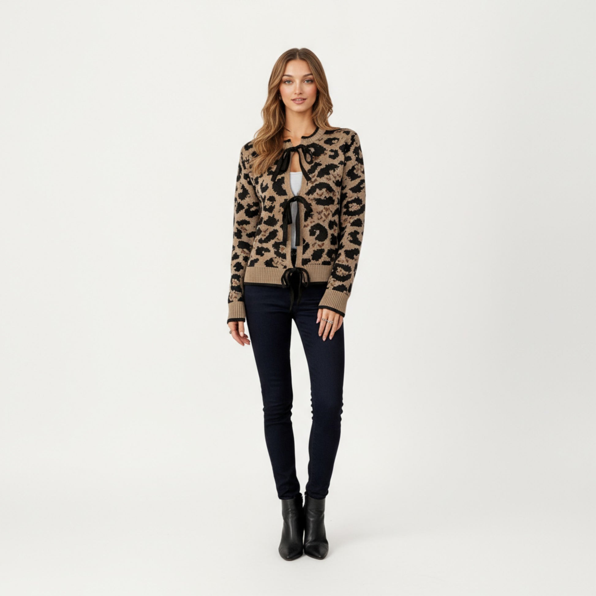 The Anna-Kaci Women's Leopard Print Knit Cardigan with Front Tie Closures and Ribbed Trim adds a bold touch to your everyday style. Featuring a chic leopard pattern, this soft knit cardigan offers a relaxed fit with three dainty front ribbon ties for a feminine finish. The ribbed cuffs and hem provide structure, while the open-front design makes it perfect for layering over tanks or blouses. Both cozy and stylish, this piece easily transitions from casual daytime wear to evening outings.