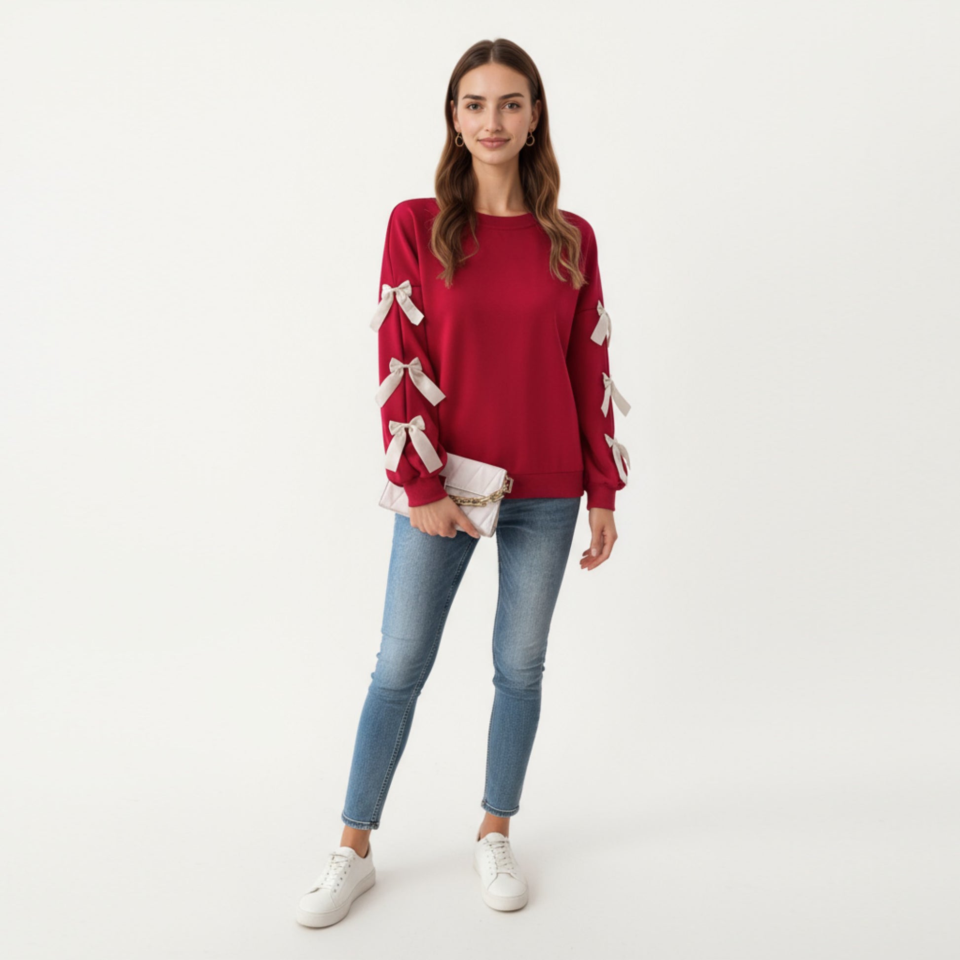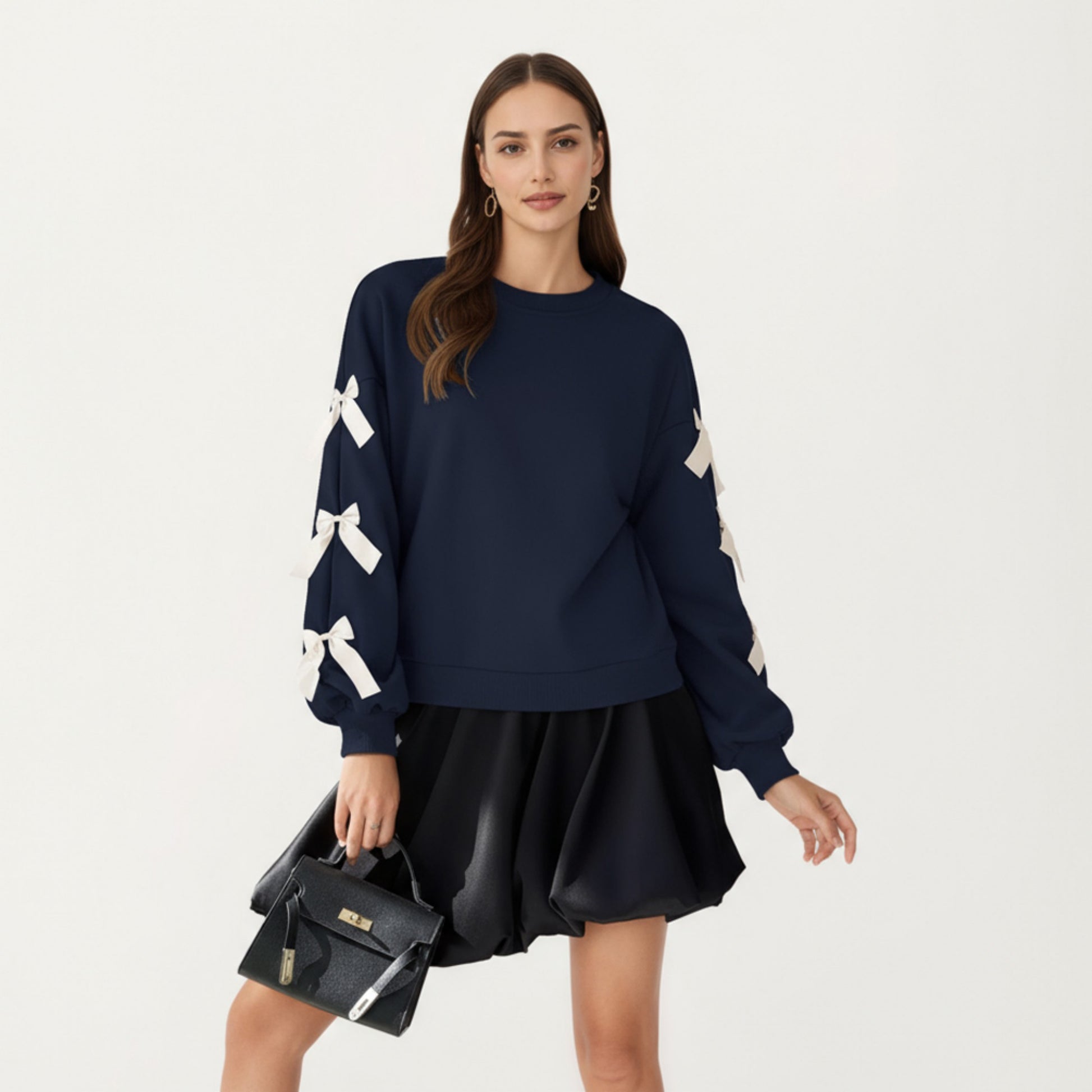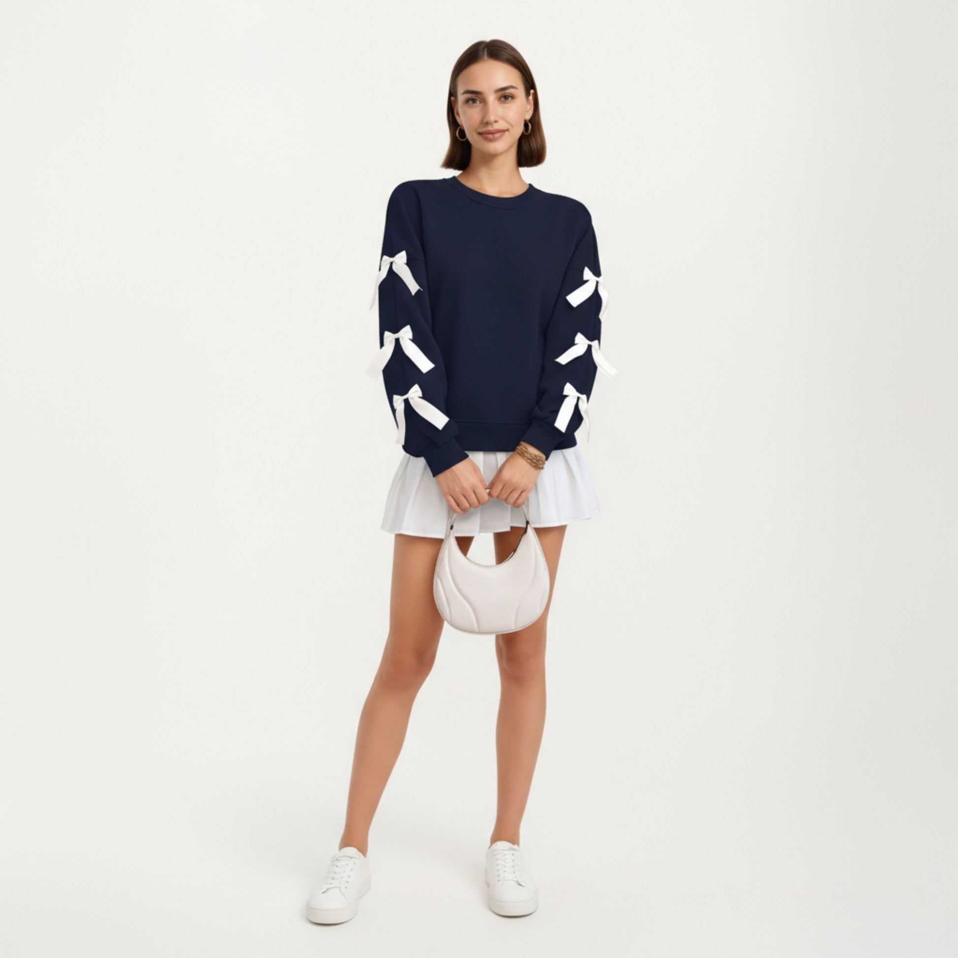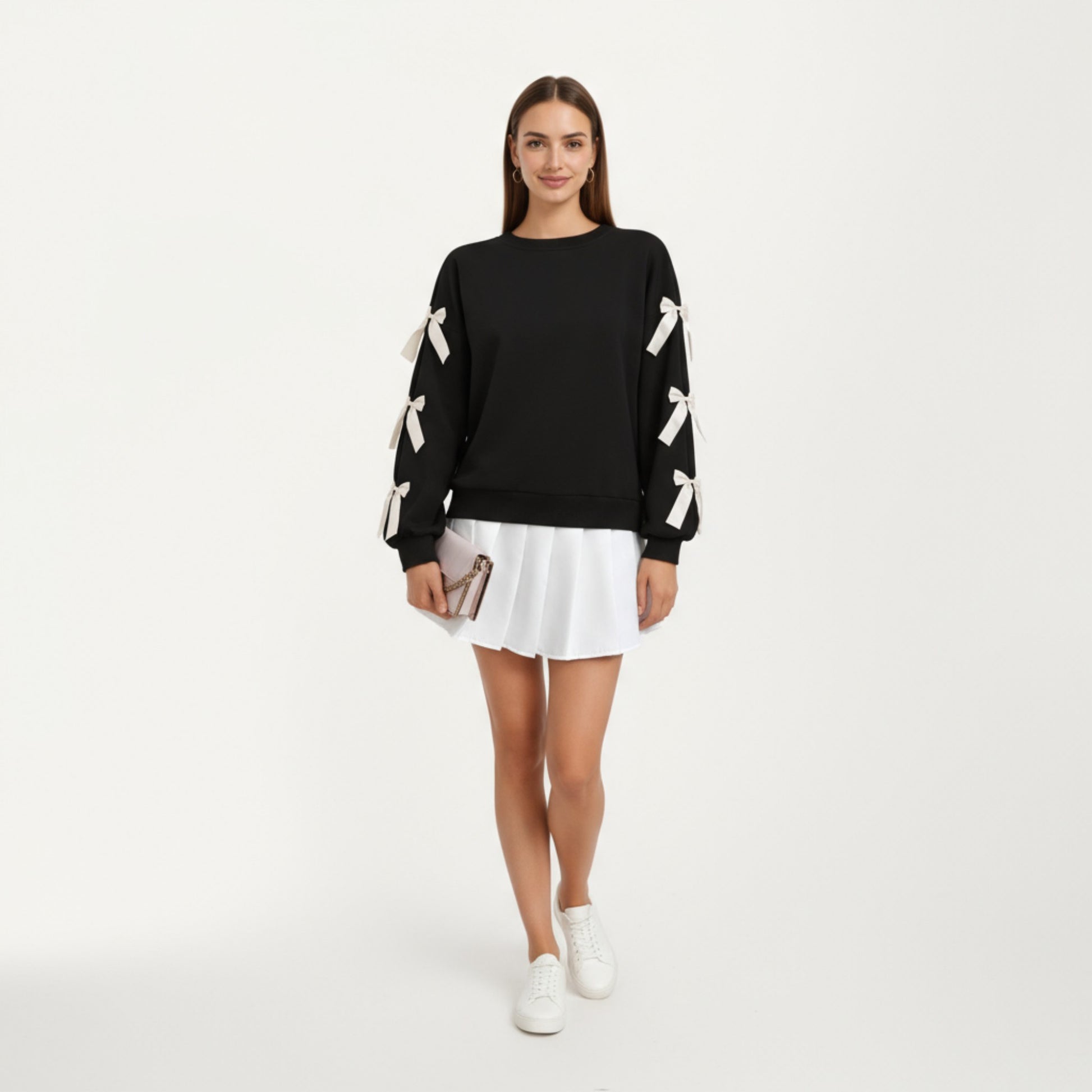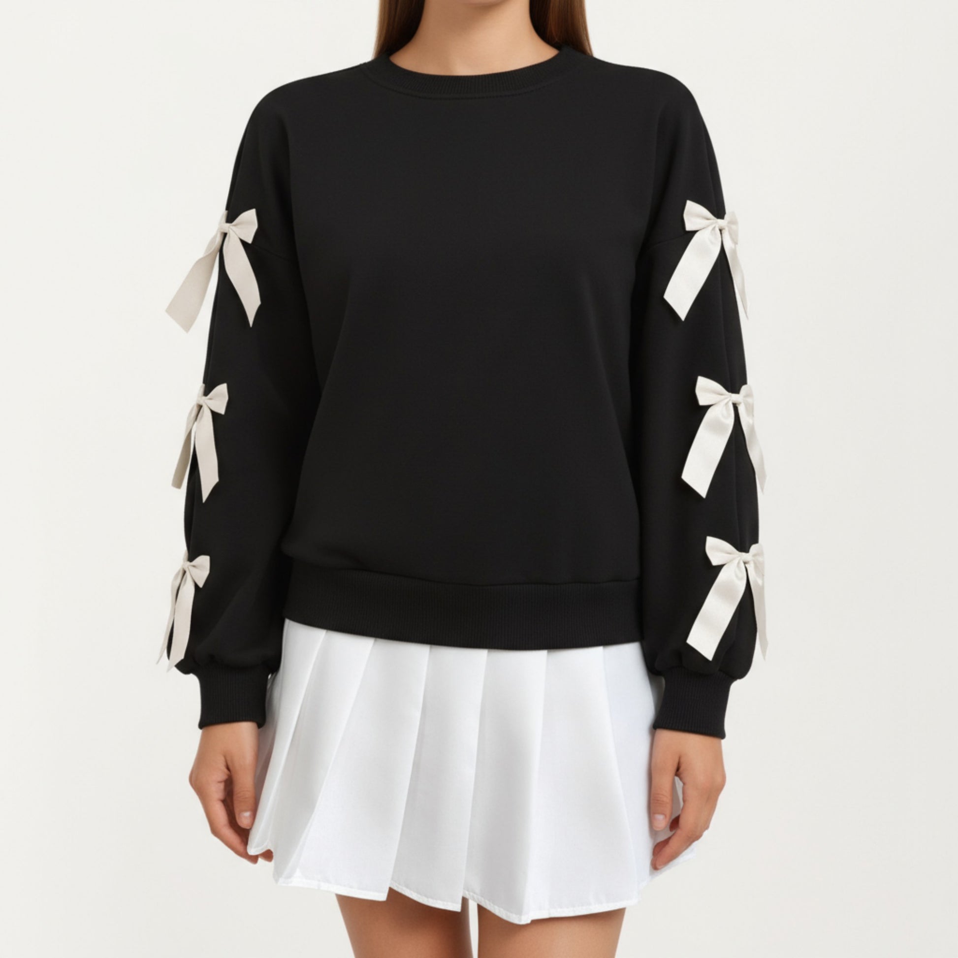 Long Sleeve Pullover Sweatshirt with Ribbon Bow Tie Details on Sleeves