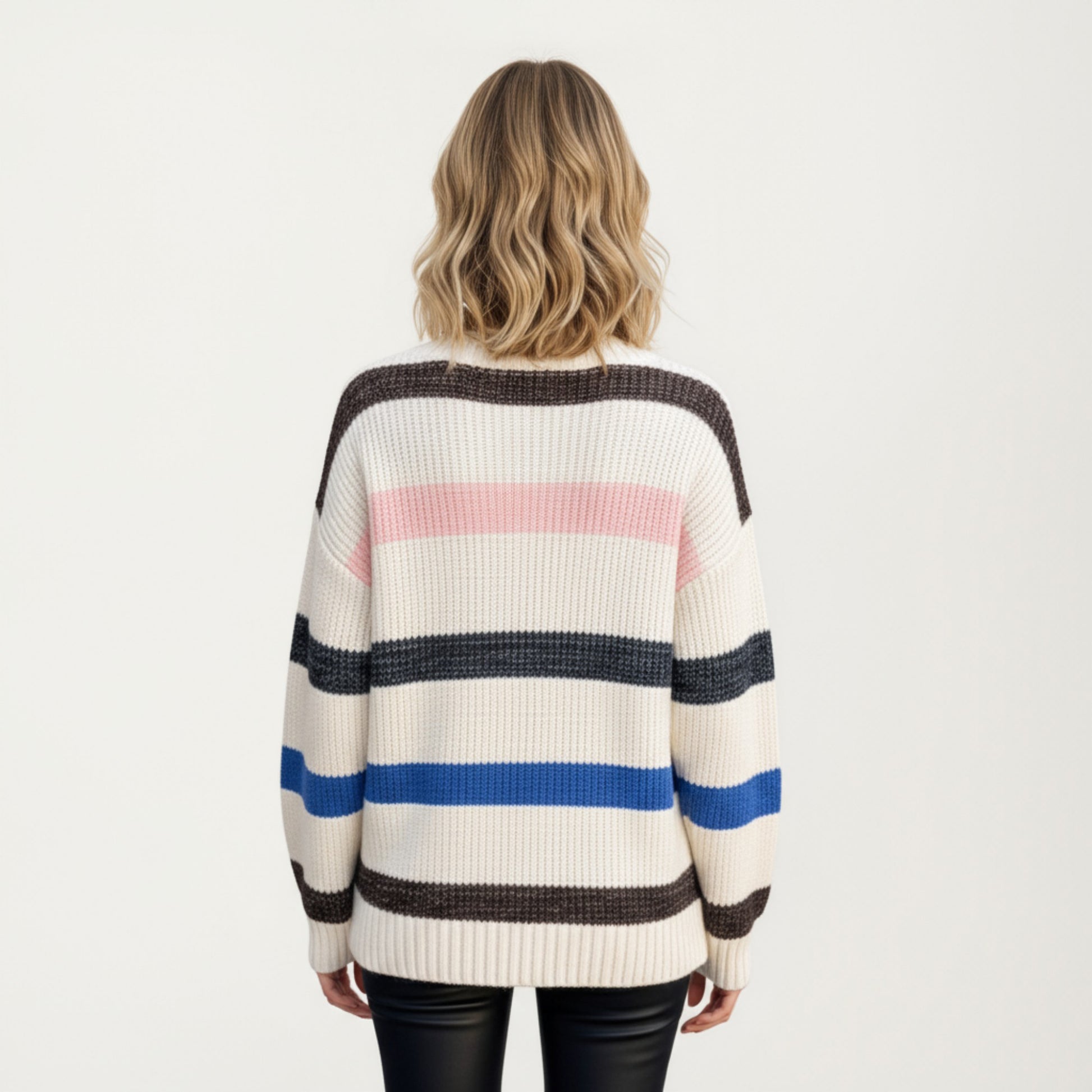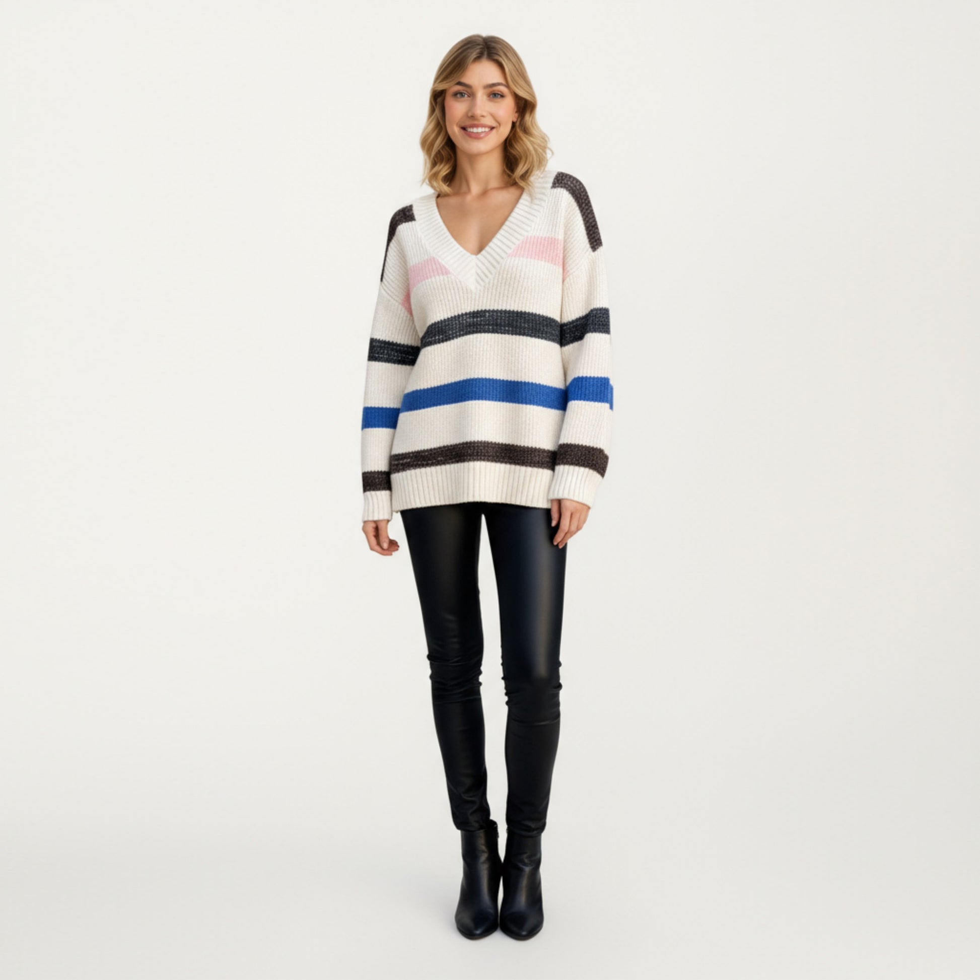 V-Neck Long Sleeve Ribbed Knit Sweater with Bold Multi-Color Horizontal Stripes