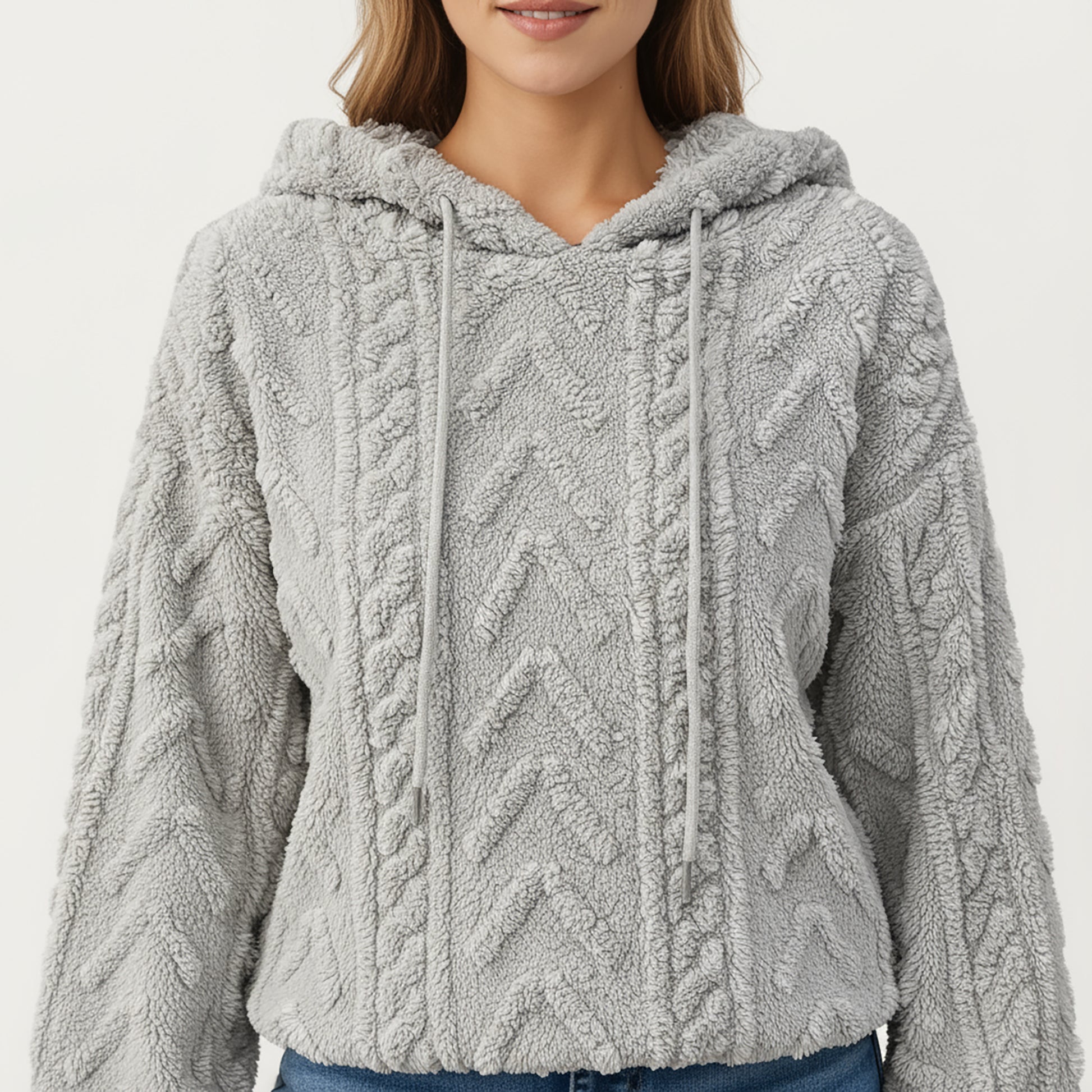 Plush Textured Hoodie with Cable Inspired Patterning, Soft High Pile Fabric, Relaxed Long Sleeves and Ribbed Trim Accents
