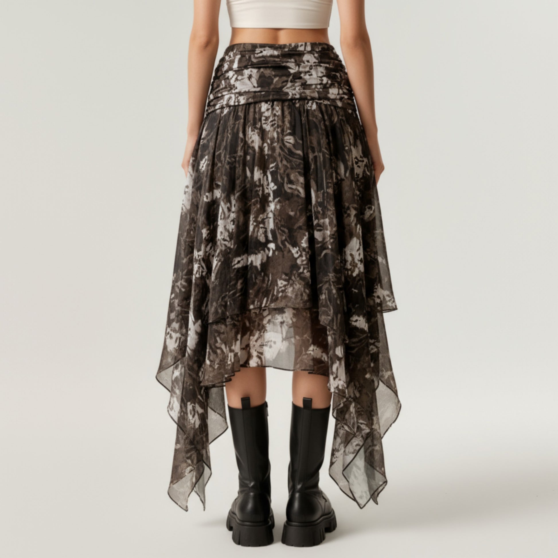 Asymmetrical Floral Chiffon Midi Skirt with Draped Waist and Layered Handkerchief Hem