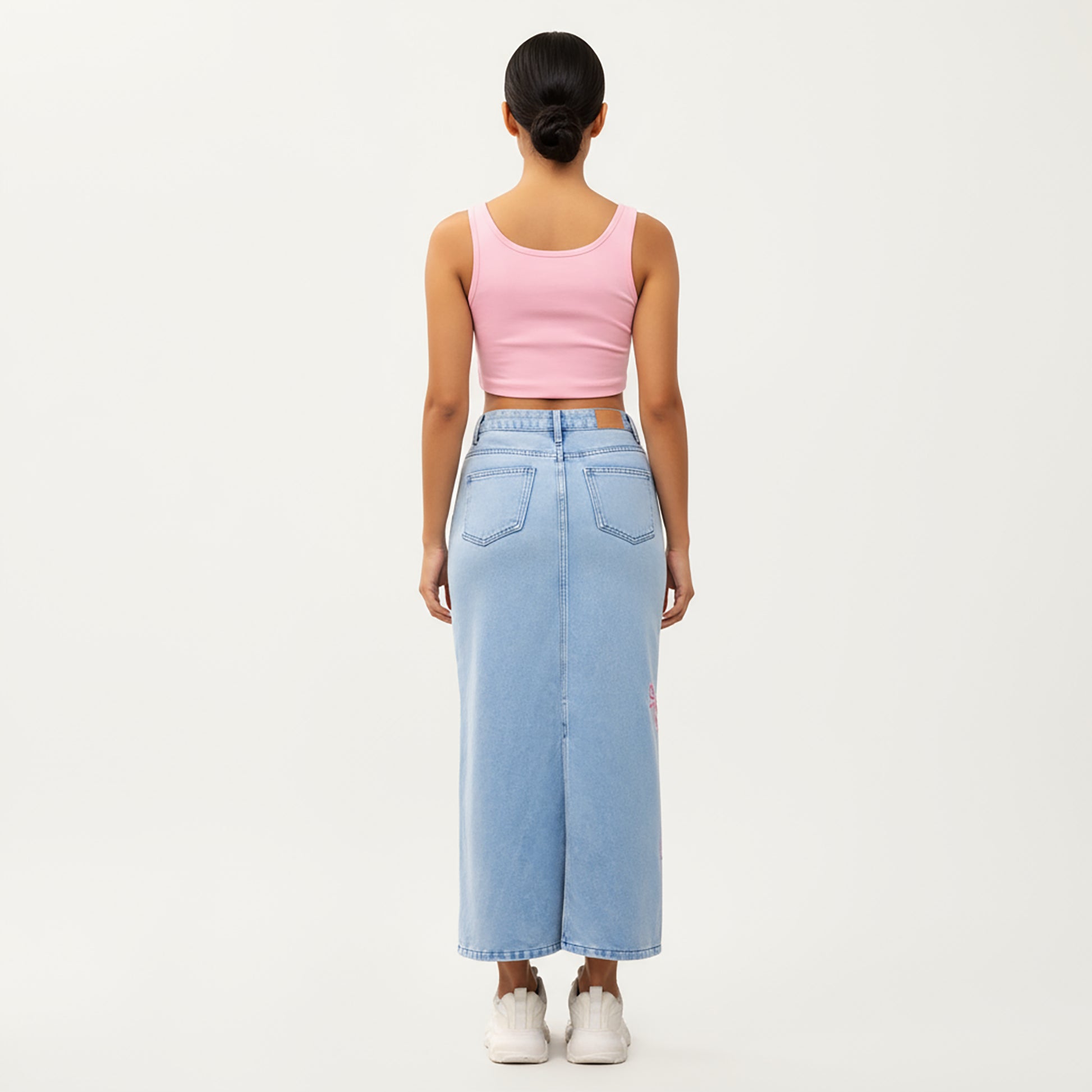 High Waist Denim Maxi Skirt with Embroidered Bow Details and Clean Straight Silhouette Featuring a Structured Waist and Smooth Finish