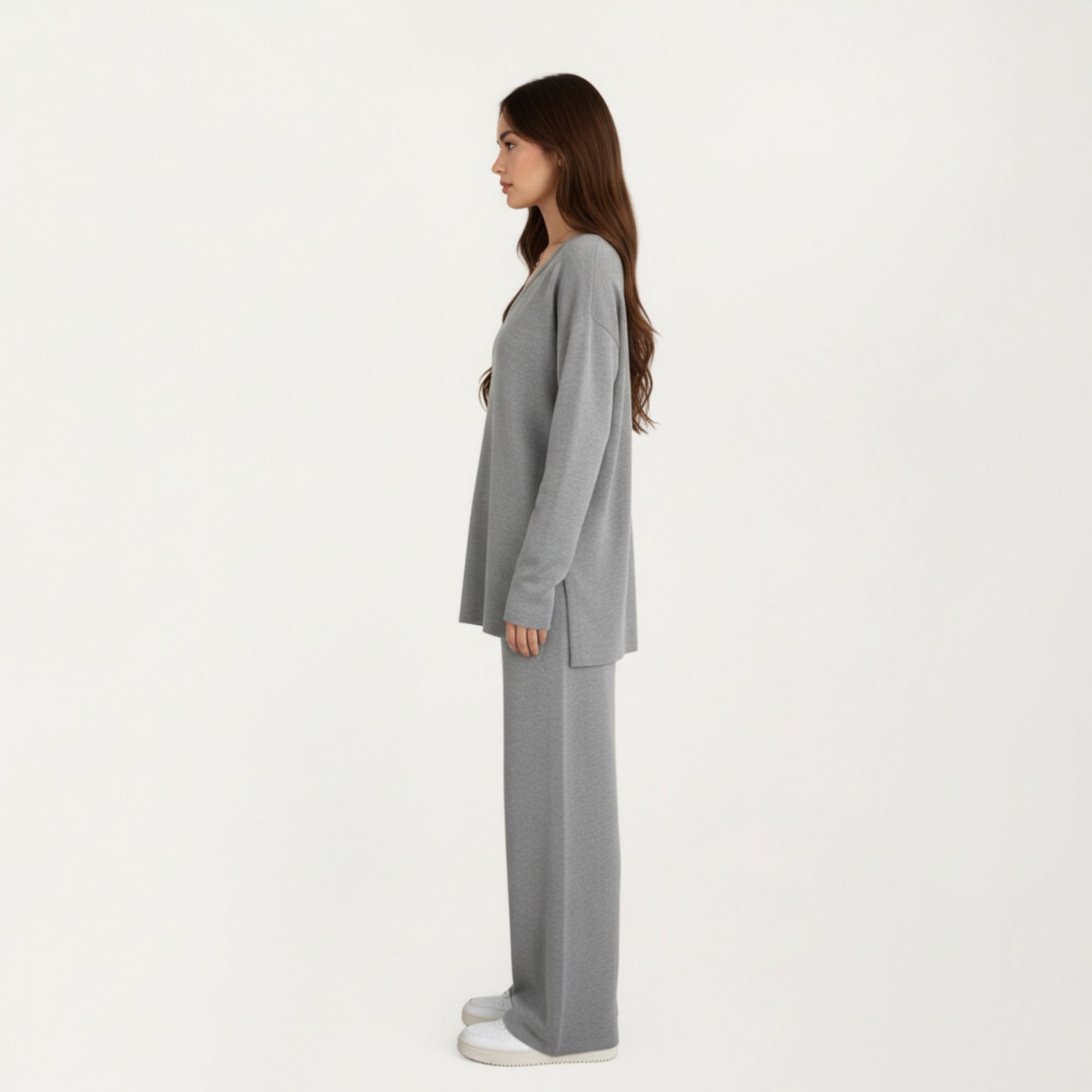 Maternity Relaxed Fit Long Sleeve V-Neck Top and Soft Wide-Leg Lounge Pants Set with Easy Stretch Fabric