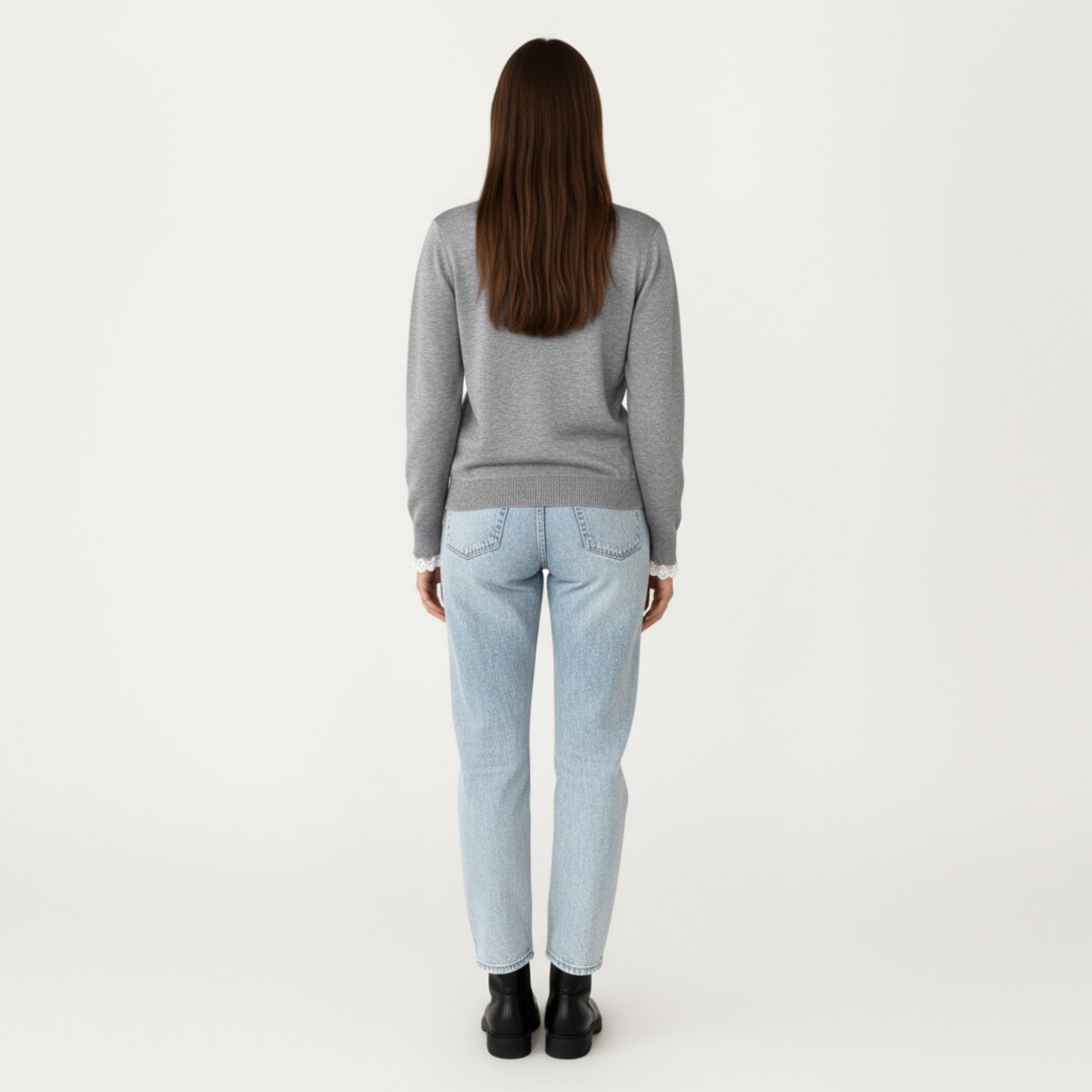 The Anna-Kaci Women's Long Sleeve Knit Top brings a charming touch to classic style with its delicate lace-trimmed collar and cuffs. The button front detail enhances its feminine appeal, while the soft knit fabric offers comfort and structure. Perfectly tailored for a polished yet cozy look, this top pairs effortlessly with jeans or skirts for both casual and refined occasions.