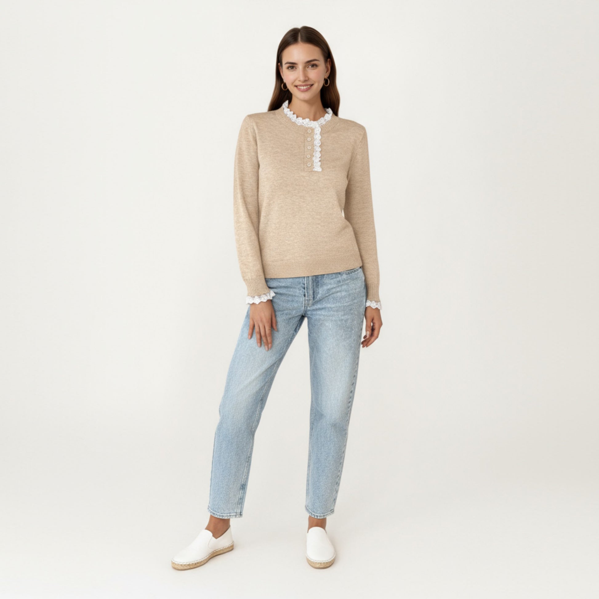 Long Sleeve Knit Top with Lace Trim Collar and Button Front Detail