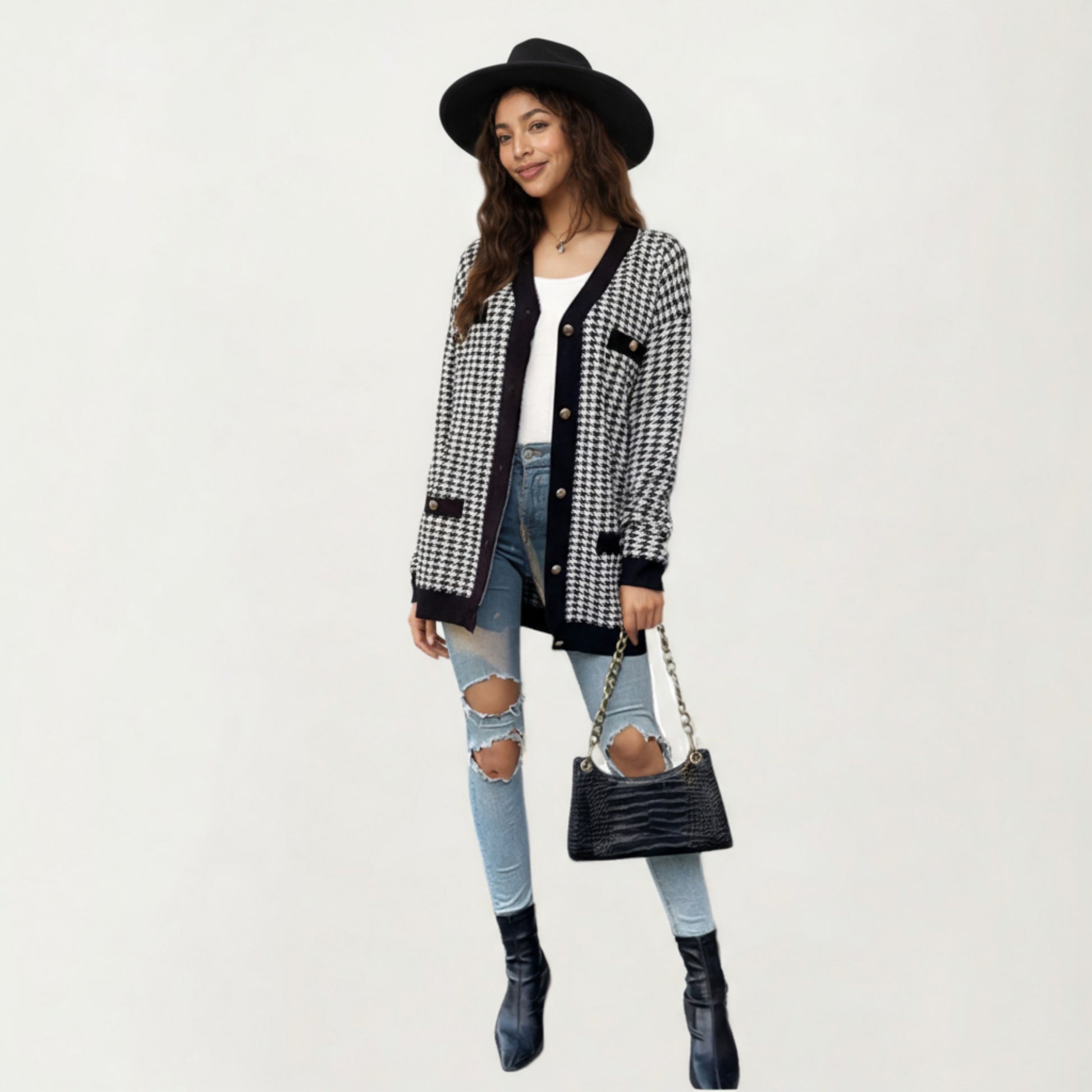 Long Sleeve Houndstooth Knit Cardigan with Button Front and Pocket Detail