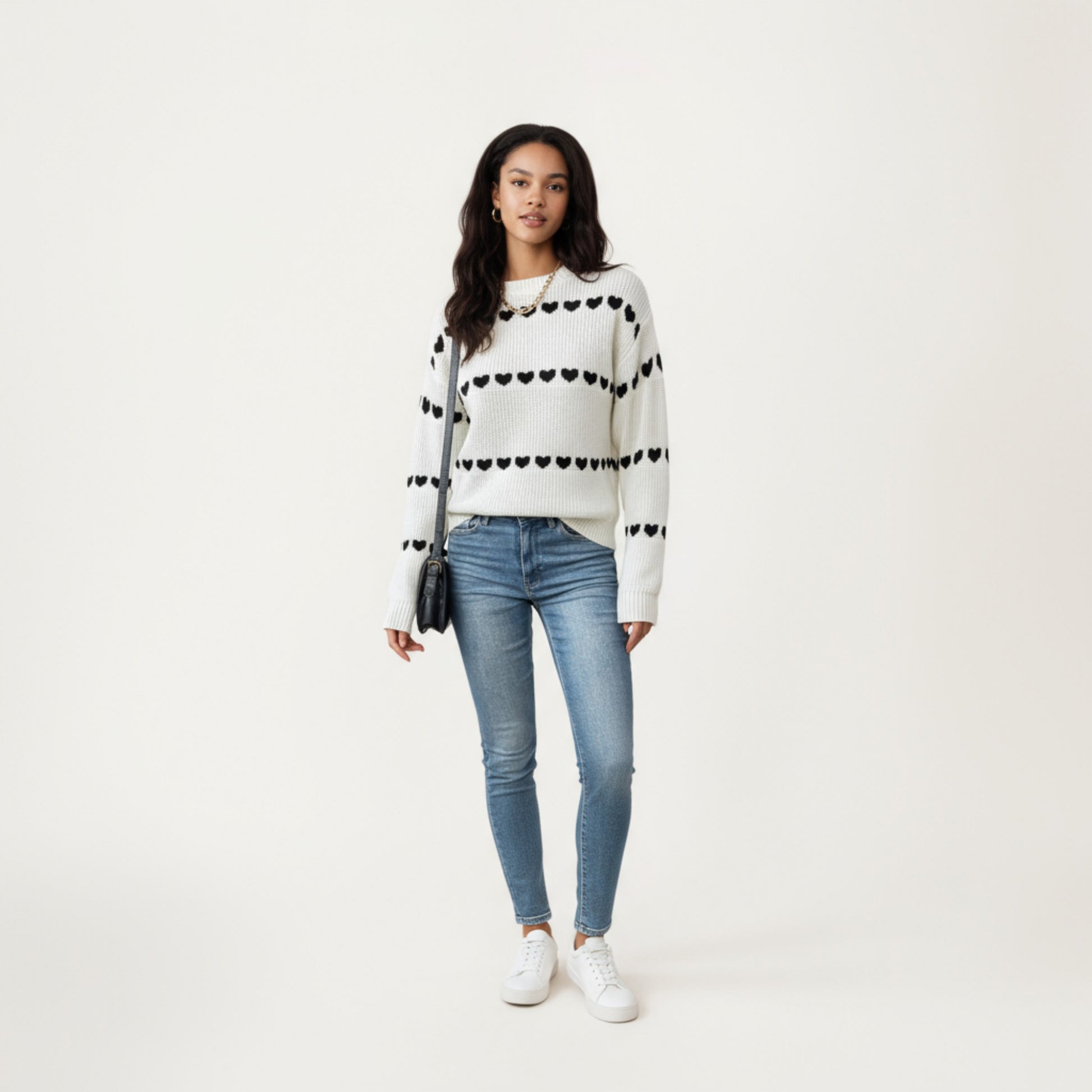 Long Sleeve Knit Sweater with Heart Pattern and Ribbed Trim