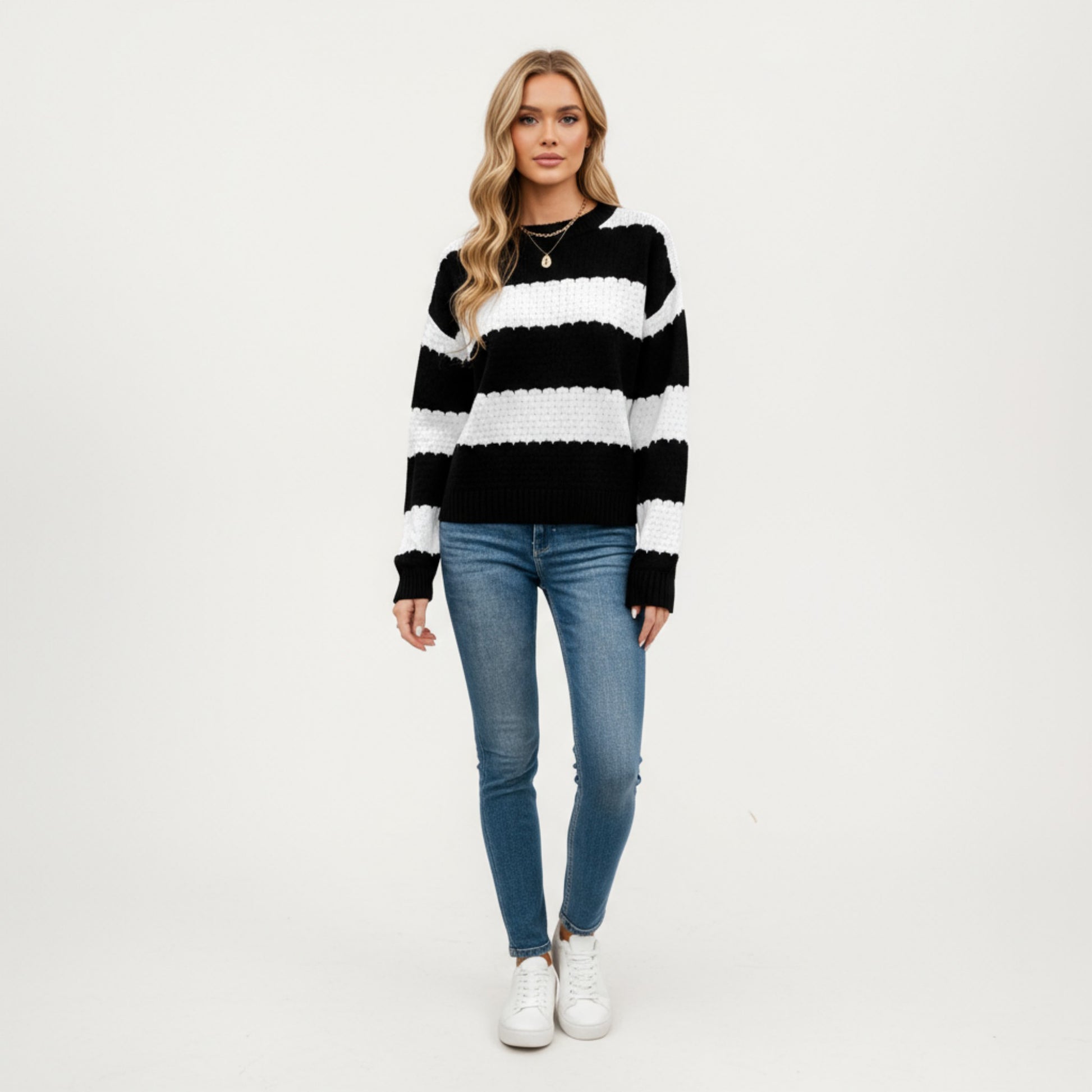 Long Sleeve Knit Sweater with Bold Horizontal Stripes and Ribbed Trim