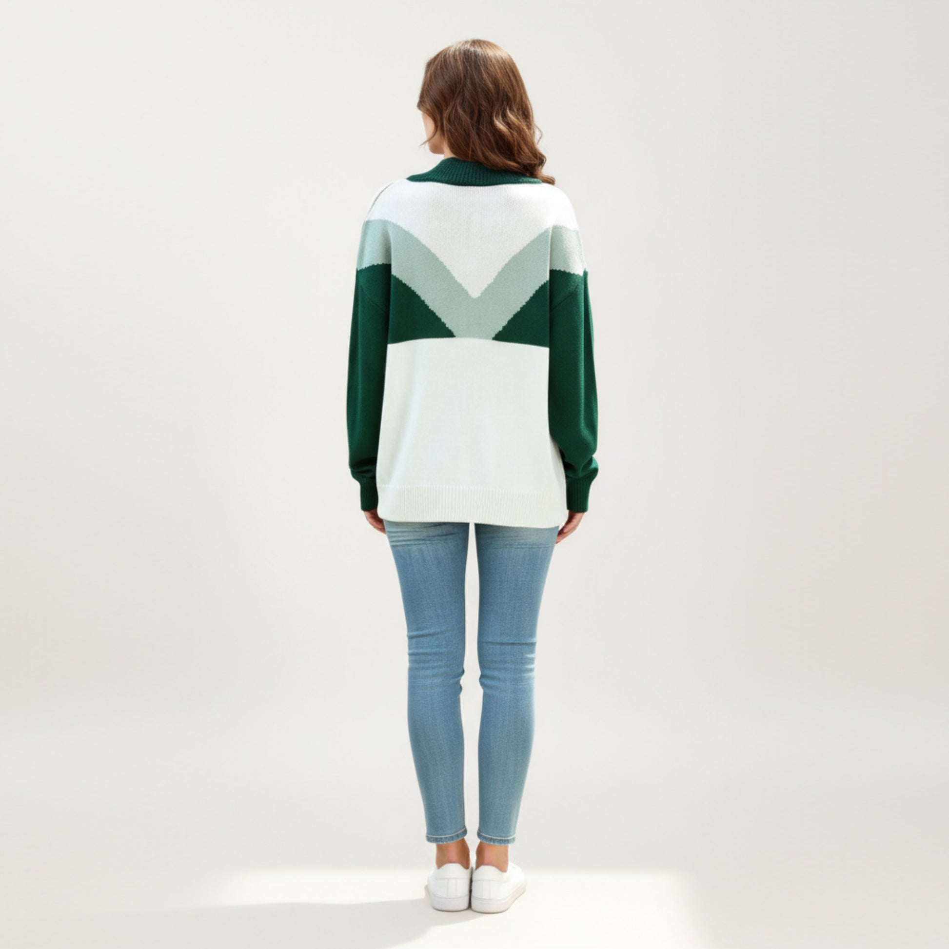 The Anna-Kaci Women's Color Block Long Sleeve Knit Sweater blends modern style with cozy comfort. Designed with a bold geometric color block pattern, this sweater features a button-down collar detail for a polished yet relaxed look. The soft knit fabric and ribbed cuffs provide a comfortable, structured fit, making it perfect for layering or wearing on its own. Ideal for casual outings or weekend wear, this sweater adds a refreshing pop of contemporary charm to your wardrobe.