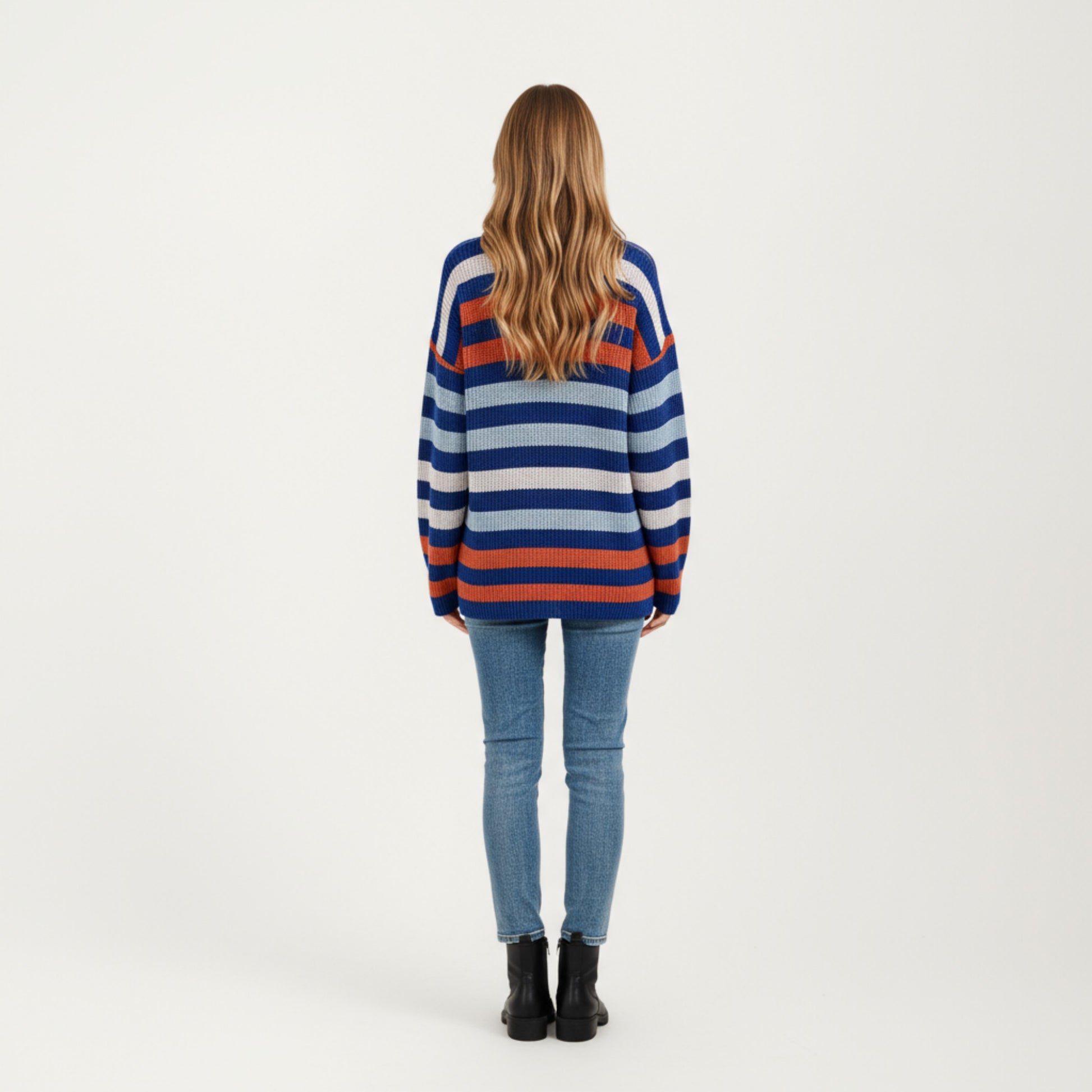 The Anna-Kaci Women's Long Sleeve Crew Neck Striped Knit Sweater combines bold pattern and comfort for effortless everyday style. Featuring a relaxed silhouette and soft knit texture, this sweater delivers cozy wearability with a modern edge. The wide horizontal stripes create a casual yet eye-catching look, while the ribbed cuffs and hem provide a polished finish. Perfect for layering or wearing solo, it¡¯s a go-to piece for chic, laid-back outfits.