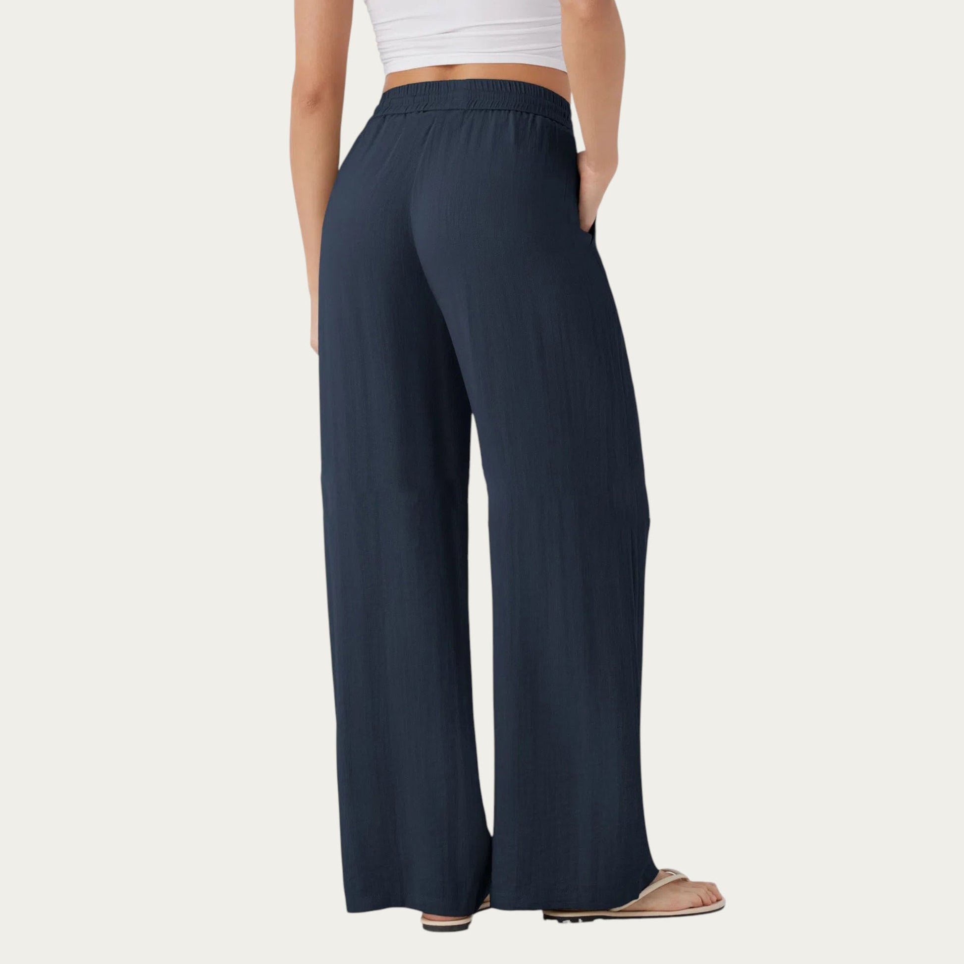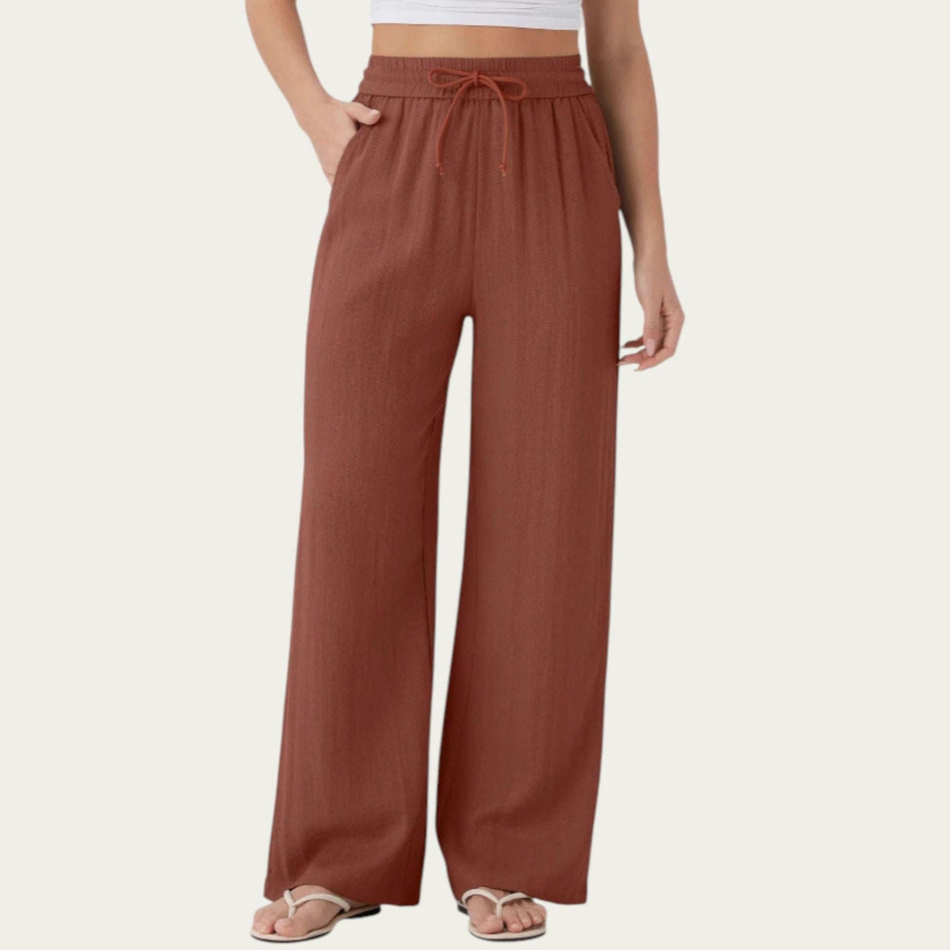 These Anna-Kaci Women's lounge pants feature a soft, relaxed knit fabric that drapes beautifully for all-day comfort. The high waist design includes a flexible stretch waistband with an adjustable drawstring for a personalized fit. Wide leg shaping offers an easy, airy feel that enhances movement, while side pockets add functional convenience. These pants deliver a clean, minimal look that pairs effortlessly with your favorite tops.