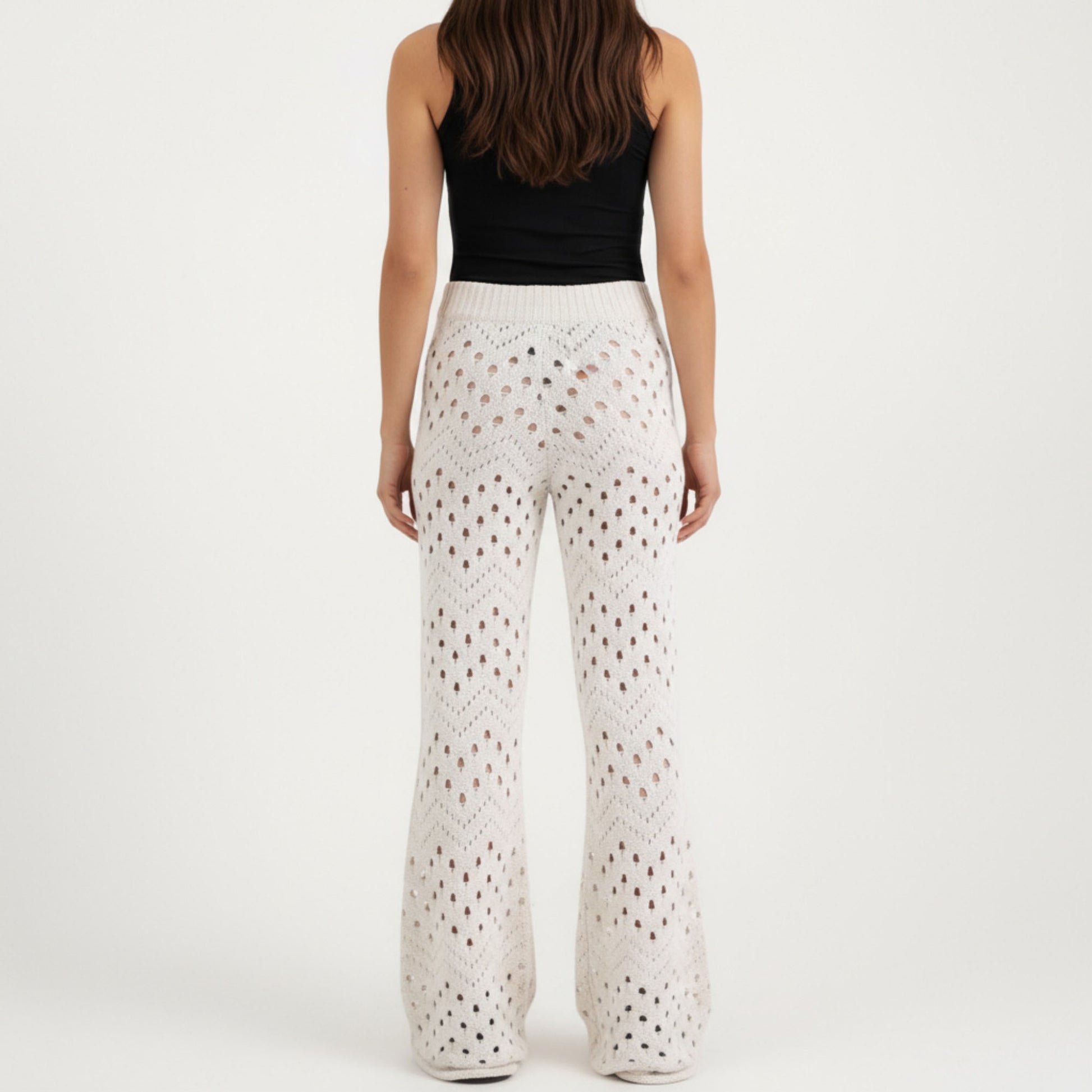 Crochet Knit 2-Piece Set with Open Front Cardigan and Wide Leg Pants Featuring Soft Textured Stitching
