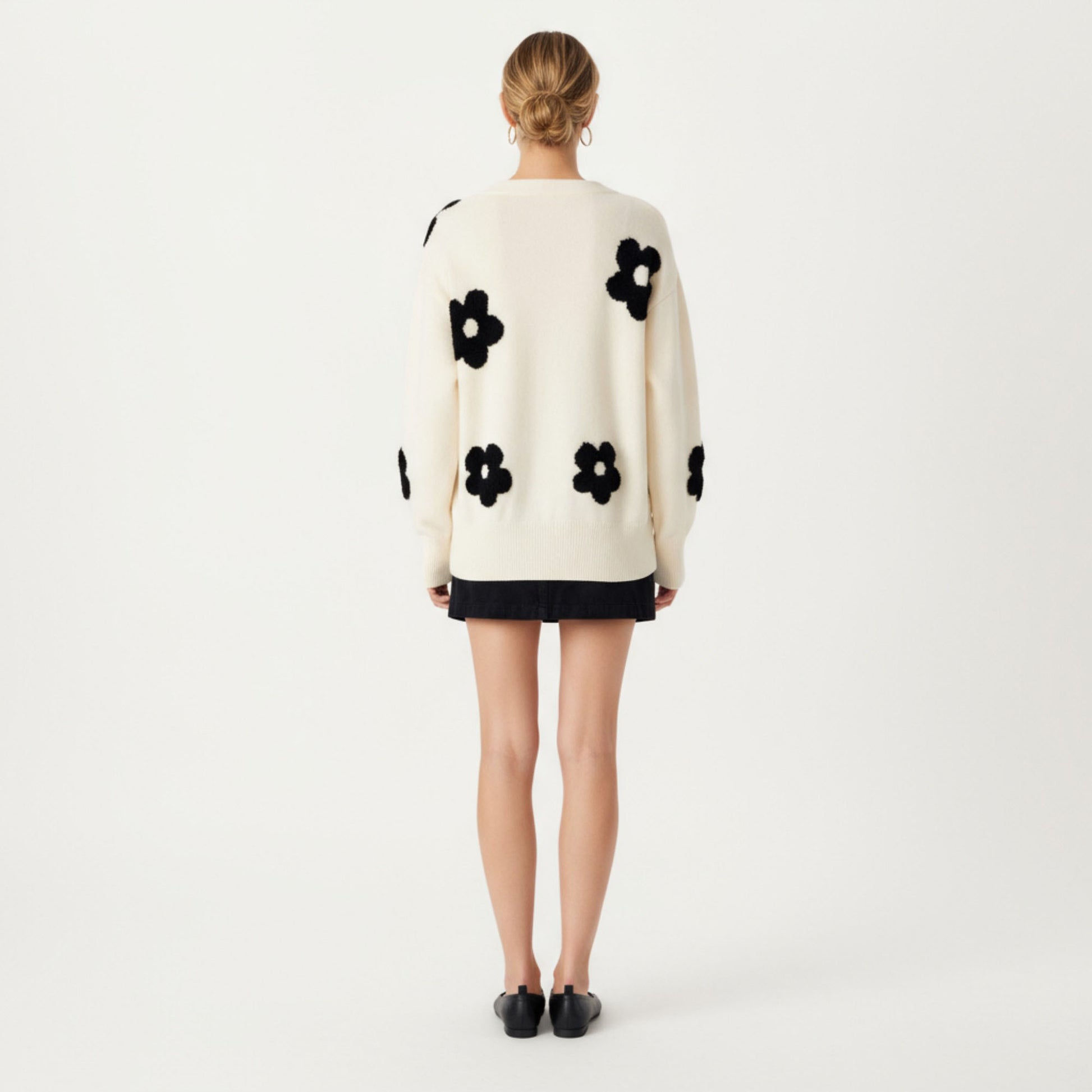 Soft Knit Button Front Cardigan with Oversized Floral Pattern Drop Shoulder Fit and Ribbed Hemline Detailing