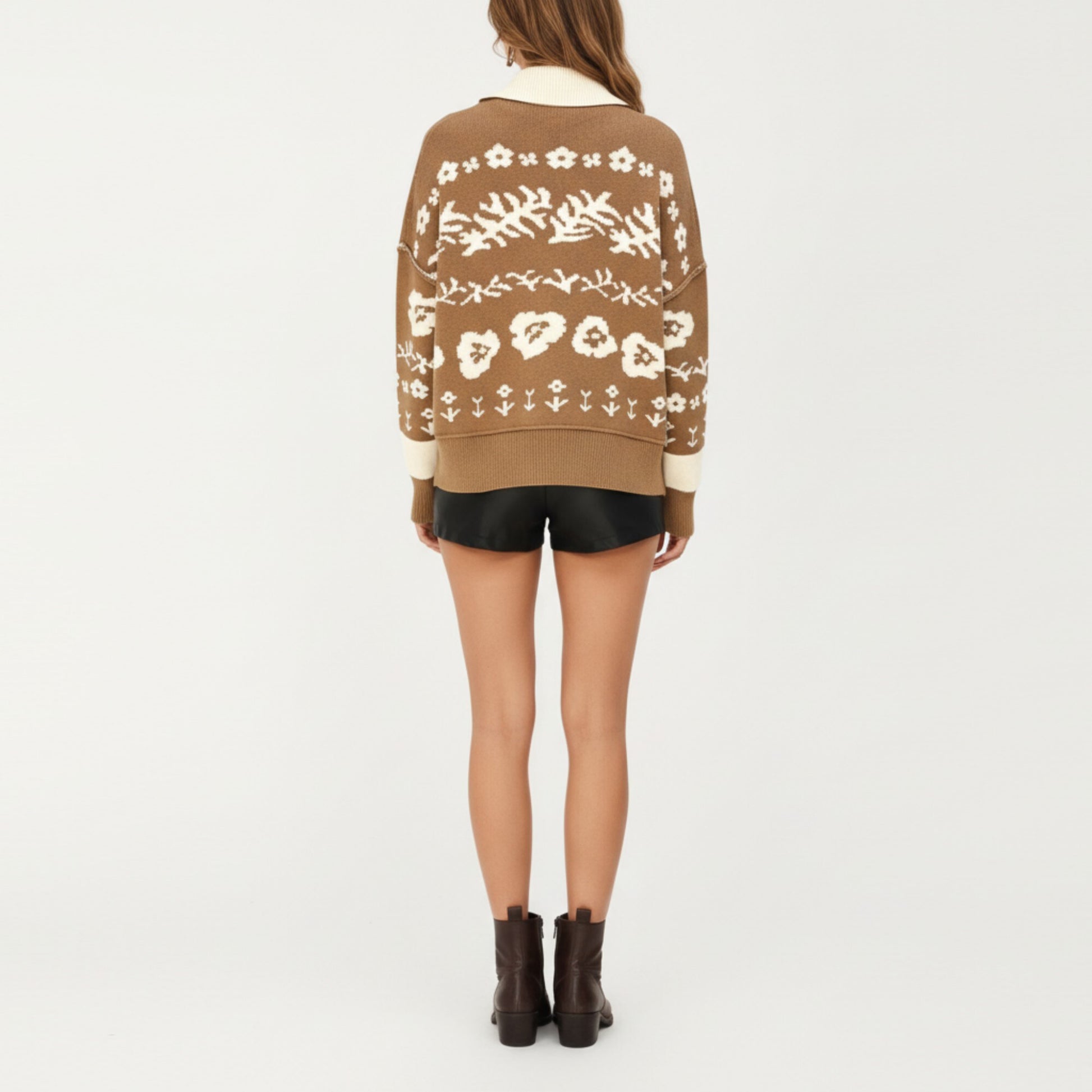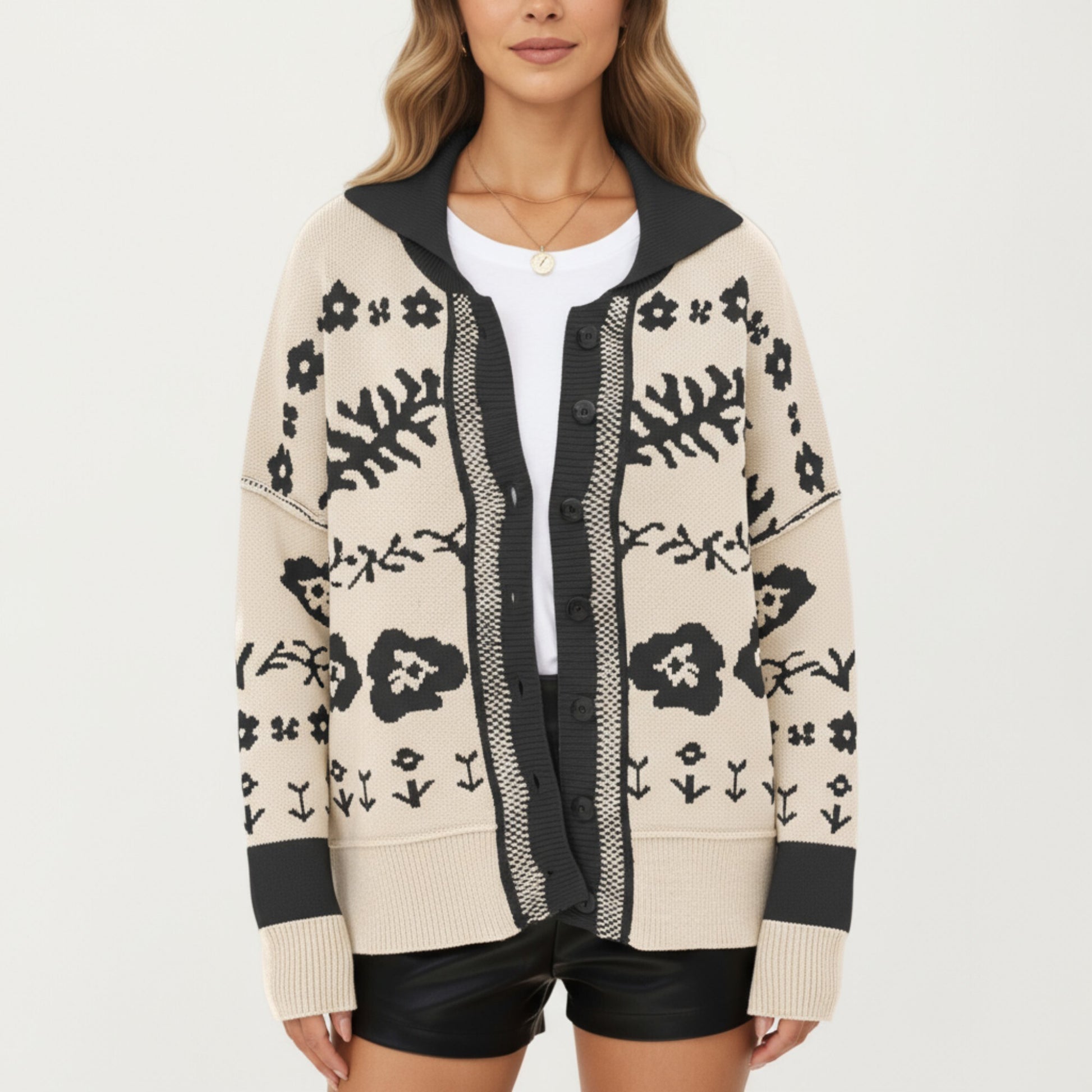Floral Jacquard Button Front Cardigan Top with Soft Knit Texture, Relaxed Drop Shoulder Fit and Ribbed Trim Detailing