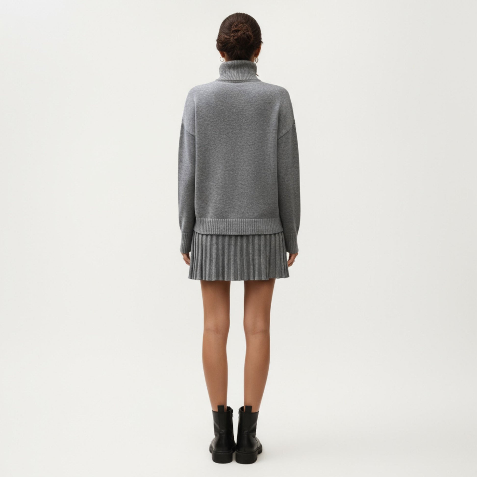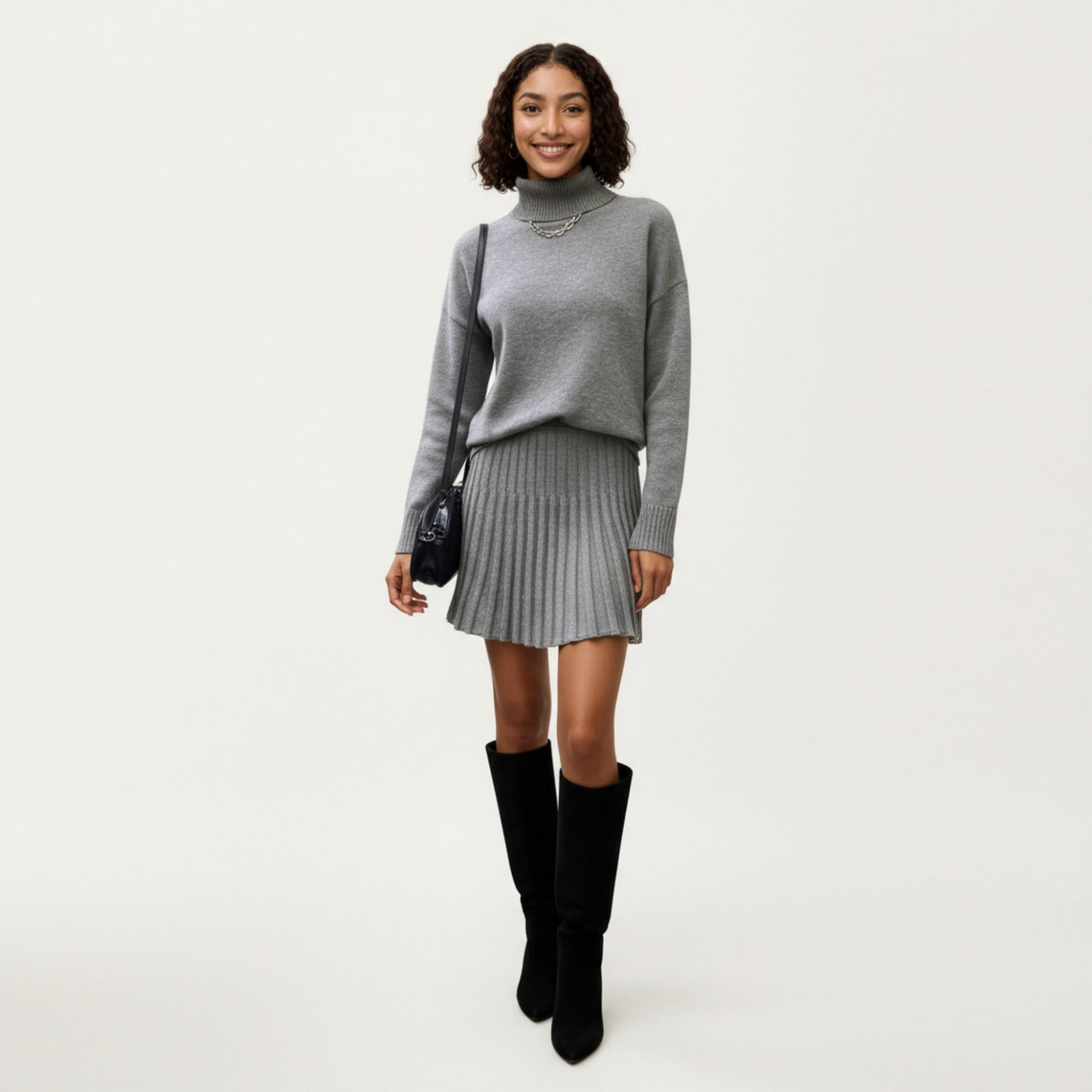 Knit Turtleneck Sweater and Pleated Skirt Set with Ribbed Texture High Neck Top and Stretch Waist Flared Hem Skirt