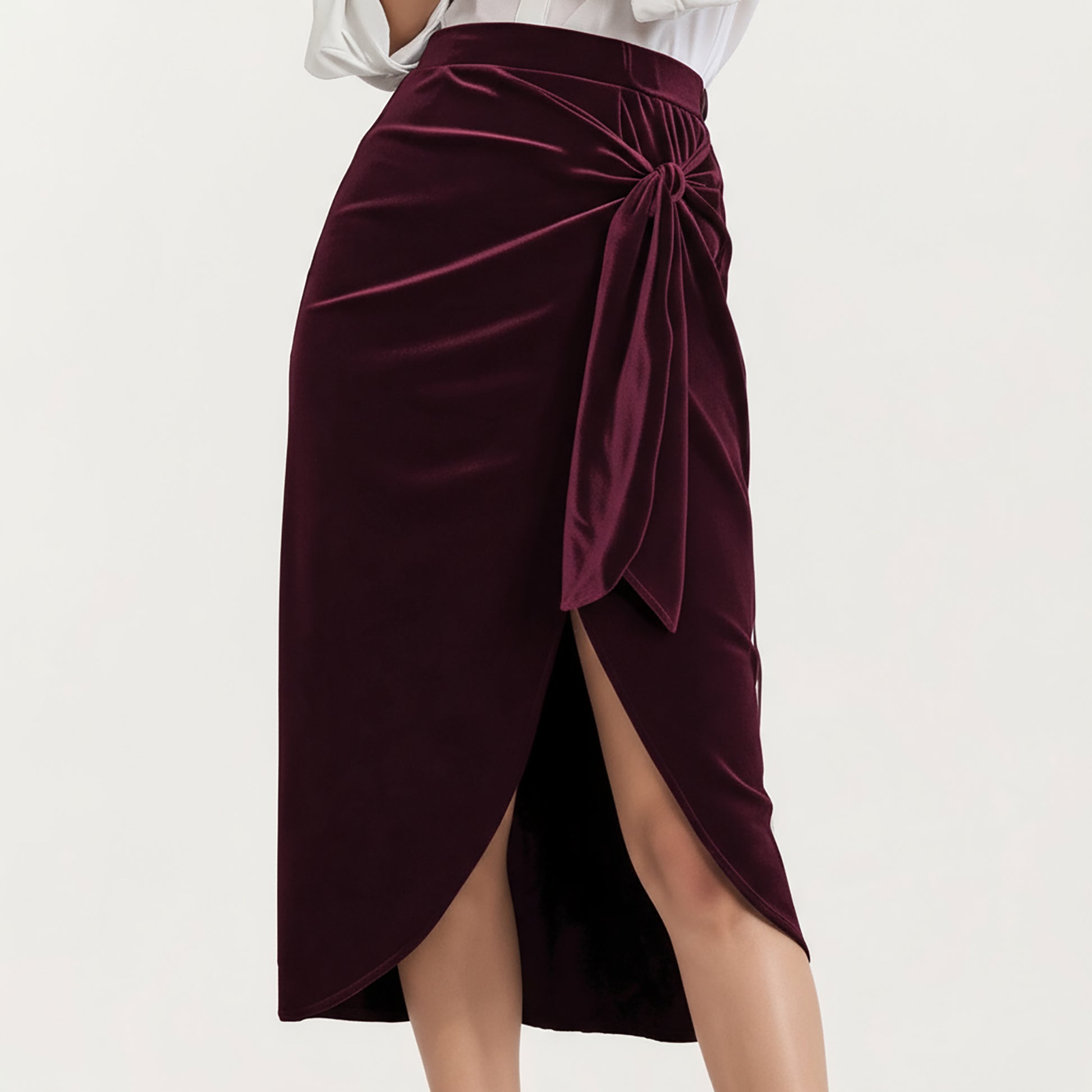 Velvet Wrap Midi Skirt with Soft Draped Texture Elegant Side Tie Detail and Flattering Overlap Front Silhouette
