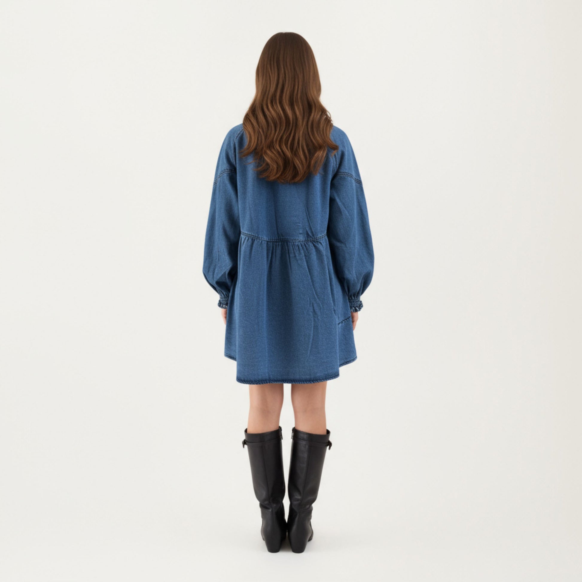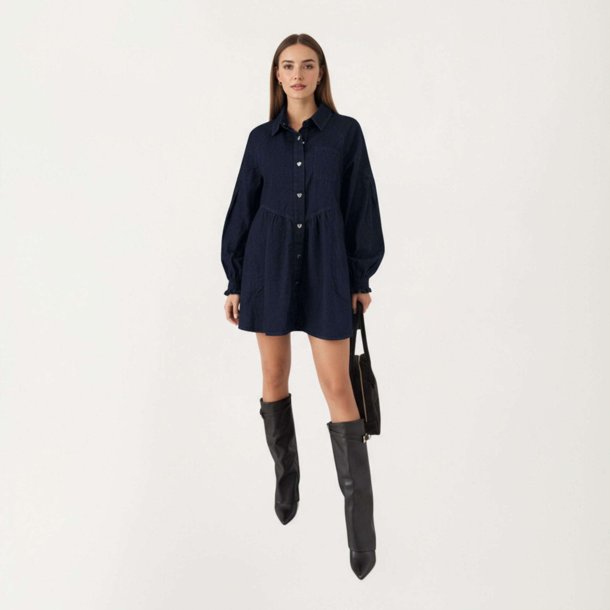 Button Front Denim Shirt Dress with Soft Woven Fabric Balloon Sleeves Front Patch Pockets