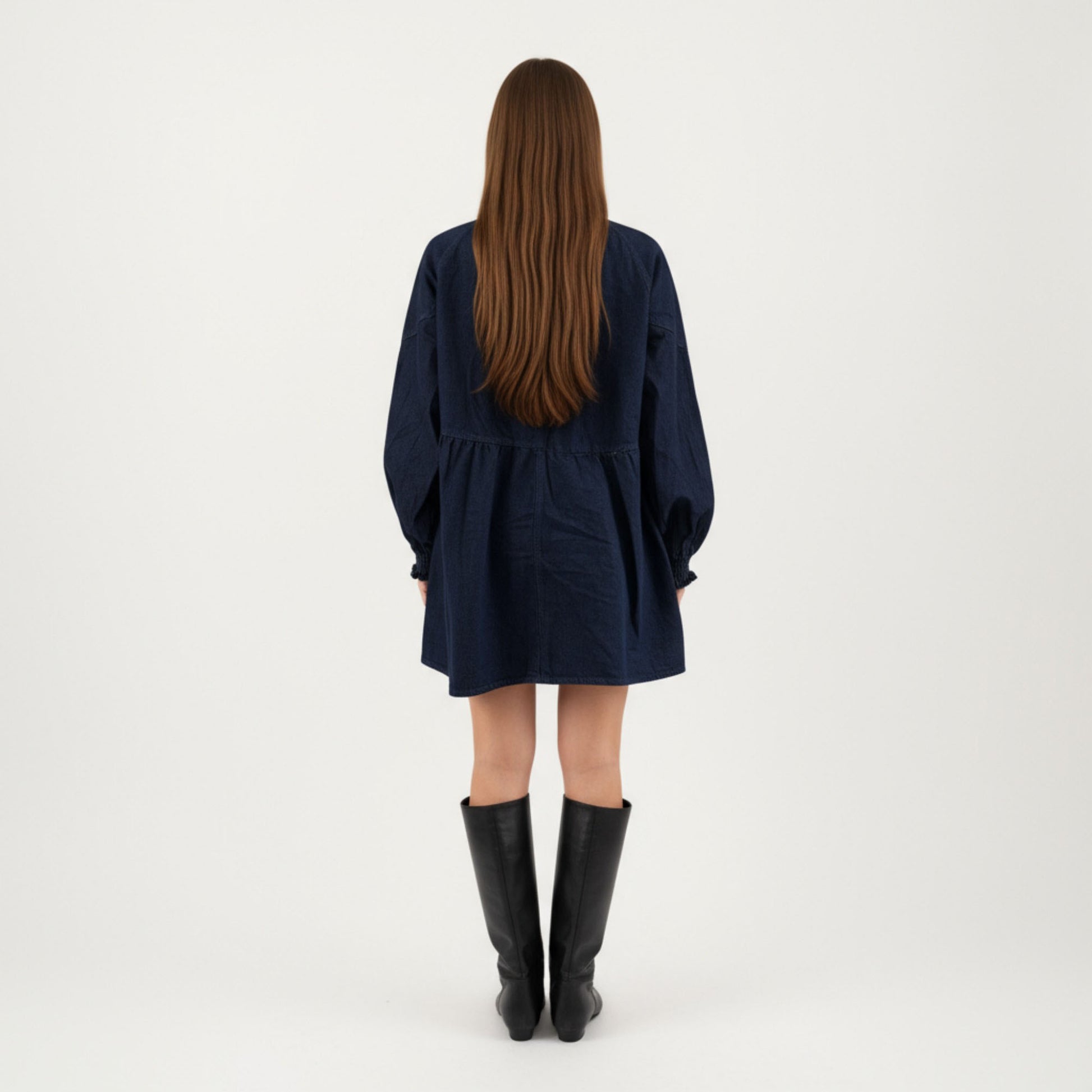 This Anna-Kaci Women's denim shirt dress features a soft woven fabric that offers structure while maintaining a comfortable relaxed feel. The button front design and spread collar create a classic look, while the balloon sleeves add volume and a modern touch. Front patch pockets and gentle gathering at the waist enhance its easy A-line silhouette. Versatile and lightweight, this dress pairs effortlessly with boots, sneakers, or casual layers.