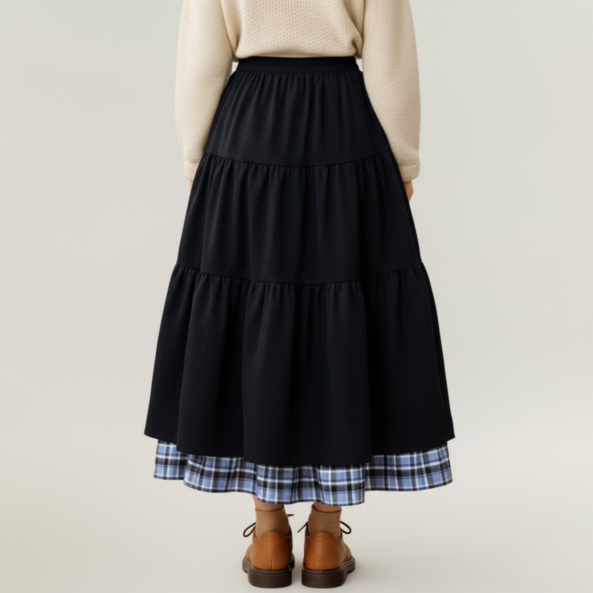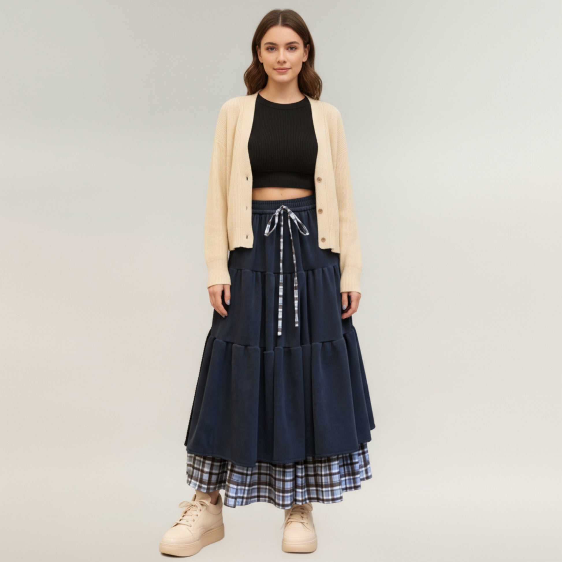 Tiered Midi Skirt with Adjustable Drawstring Waist and Layered Plaid Hem Detail for Soft Flowing Movement and Comfort