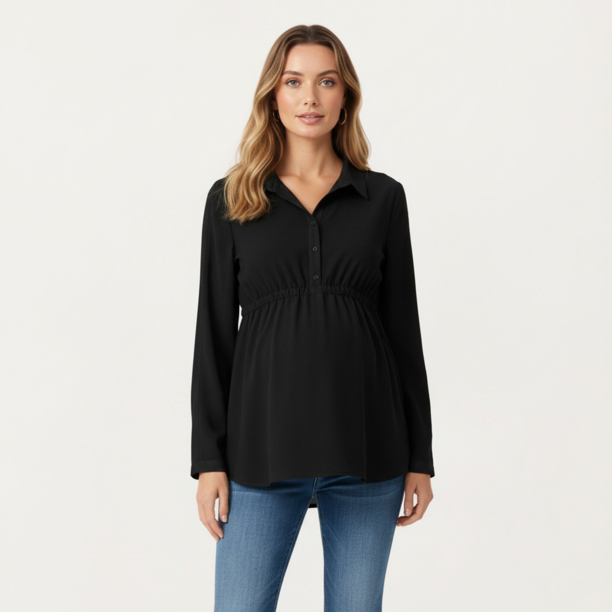 Maternity Long Sleeve Top with Collared Neckline Elastic Empire Waist and Soft Flowing Drape for Everyday Style
