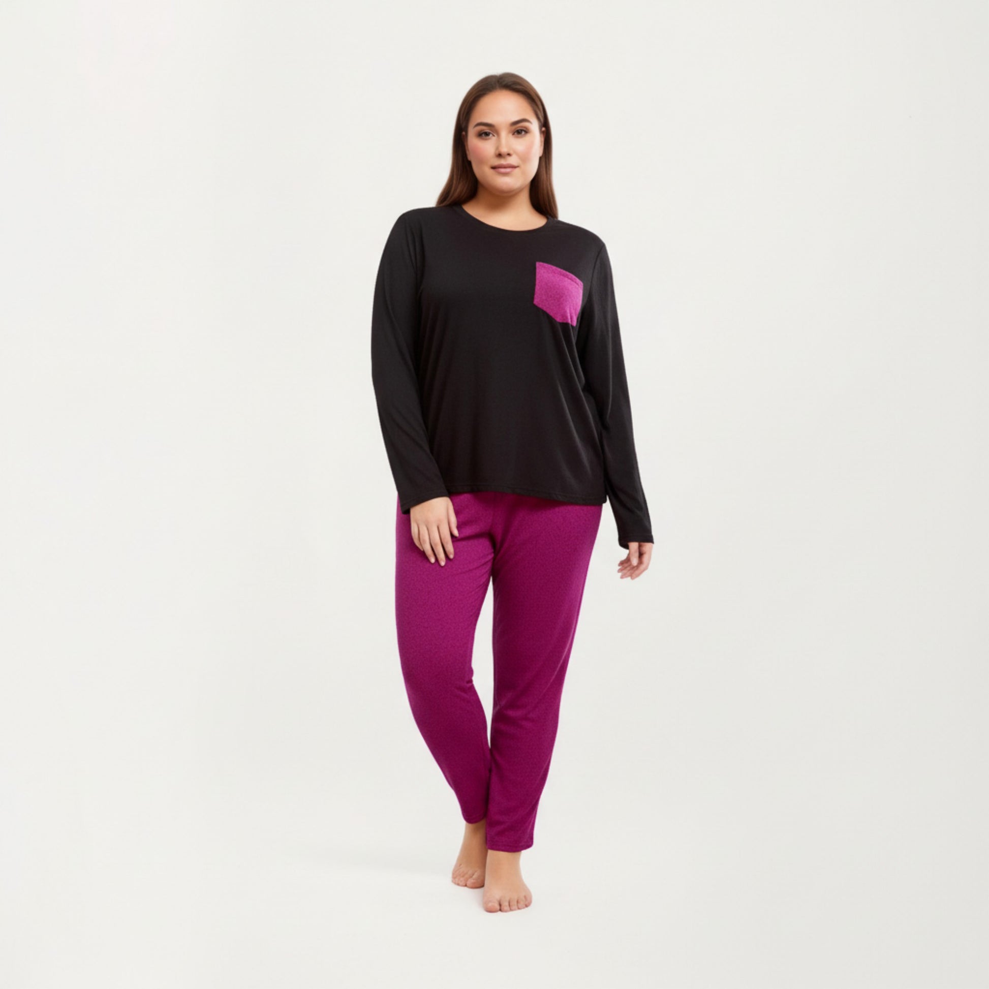 2-Piece Set Long Sleeve Knit Top with Contrast Pocket and Soft Stretch Pajama Pants with Relaxed Tapered Fit